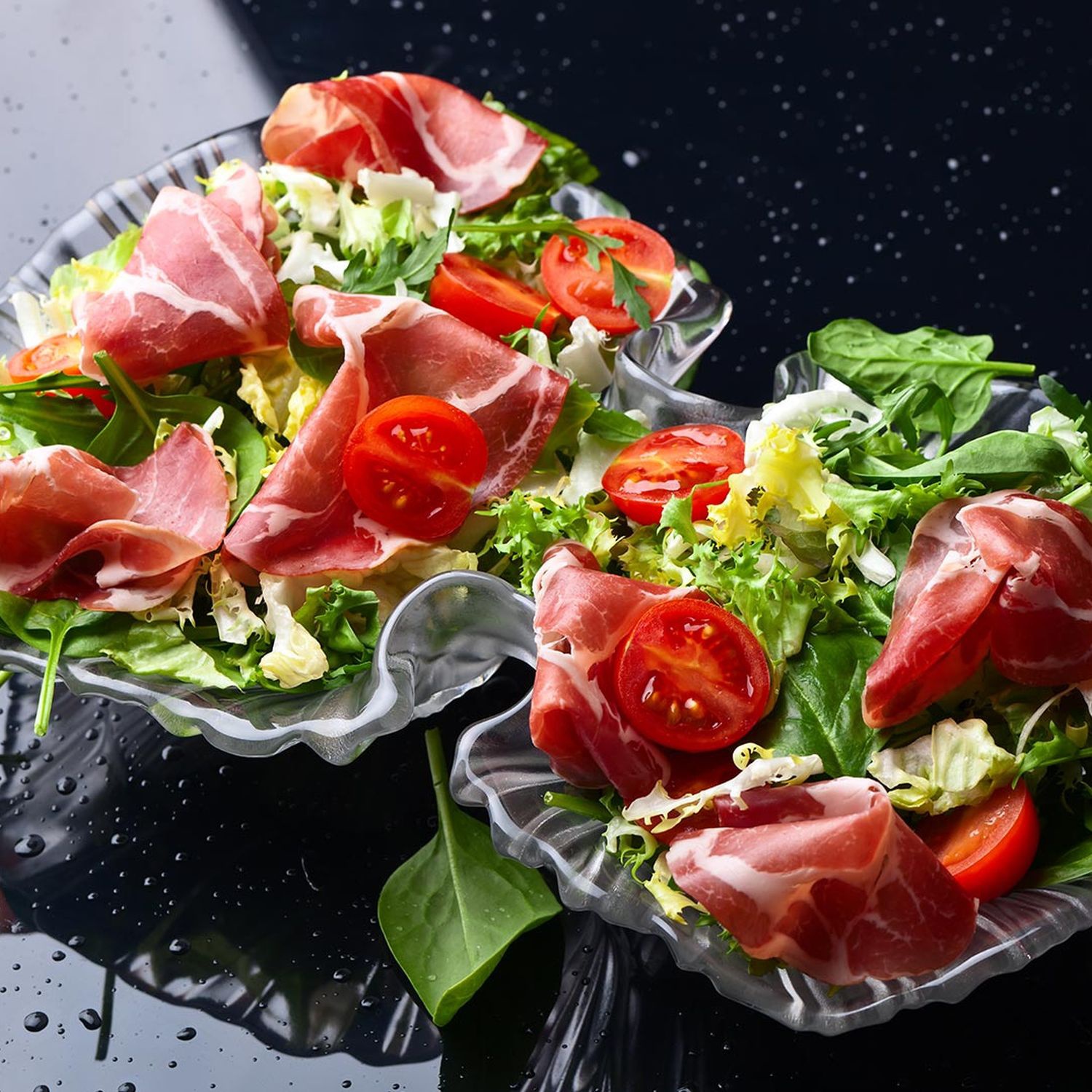 Den Salat mit den Tomaten- und Champignonstücken auf 4 Tellern anrichten, jeweils mit einer Scheibe Schinken garnieren und mit der Vinaigrette servieren.