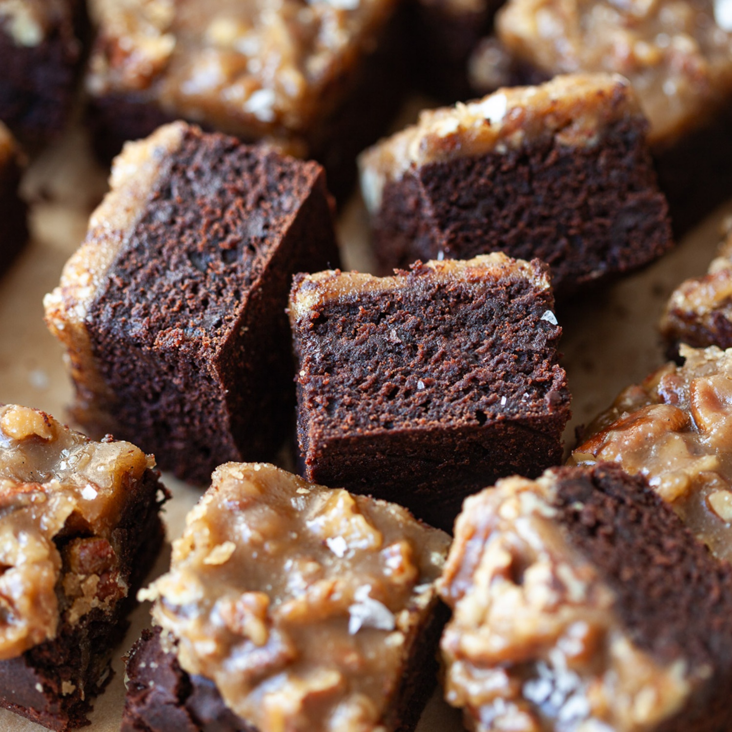 Das Karamell mit Nüssen über die abgekühlte Brownie-Basis streichen und oben mit einer Prise grobem Meersalz bestreuen. Falls das Karamell zu fest wird, vorsichtig erwärmen, damit es flüssiger und leichter zu verstreichen ist.