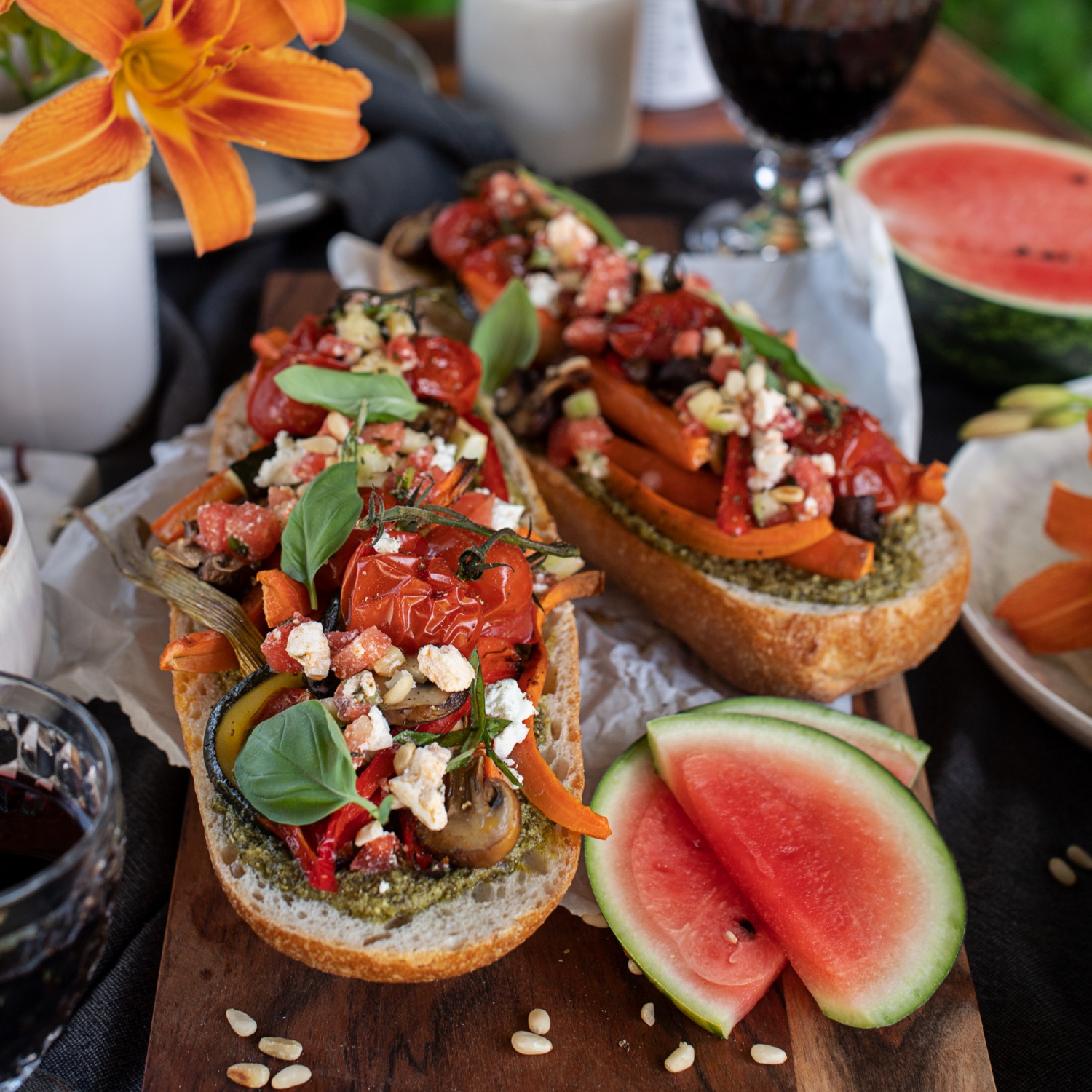 Das Baguett halbieren und beide Hälften mit Pesto bestreichen. Jeweils mit reichlich Grillgemüse und Wassermelonen-Salsa belegt servieren.