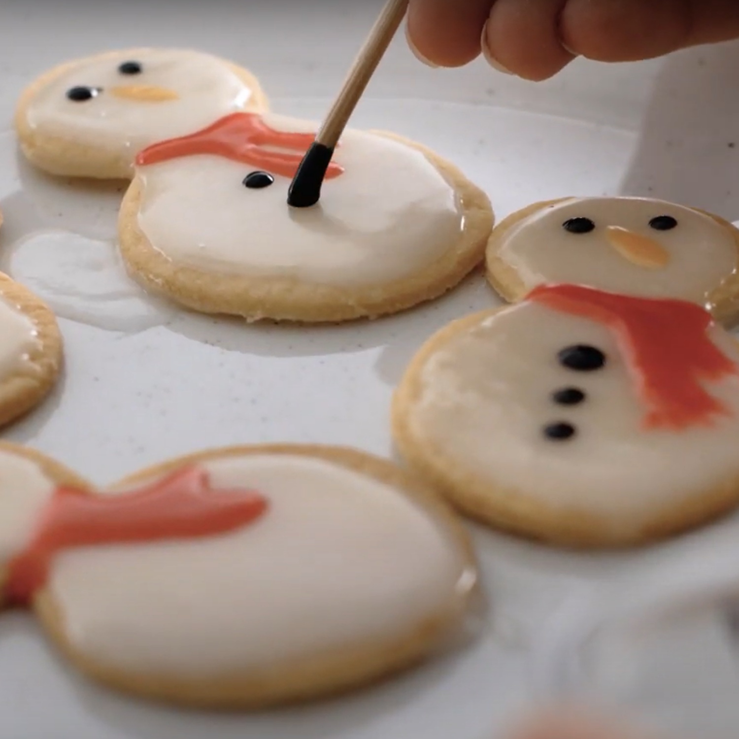 Währenddessen für die Glasur den Staubzucker in eine Schüssel sieben, Zitronensaft und Milch hinzufügen und alles gut verrühren. Die fertige Glasur in eine Dosierflasche füllen und anschließend die Kekse damit bemalen. Die restliche Glasur mit Lebensmittelfarbe vermischen und damit die Schneemänner dekorieren.