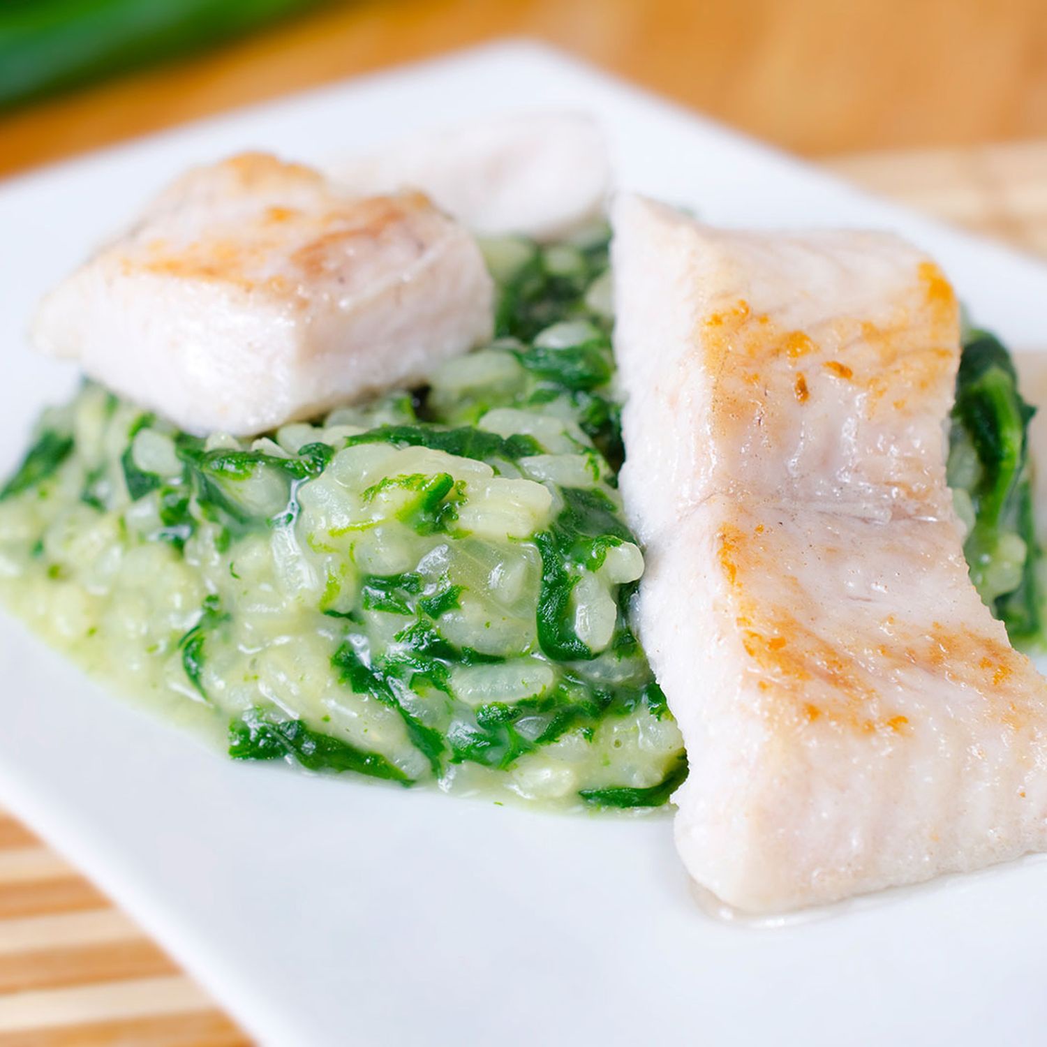 Das Risotto auf vorgewärmte Teller anrichten und mit pochiertem Fisch und Paprikabutter servieren.