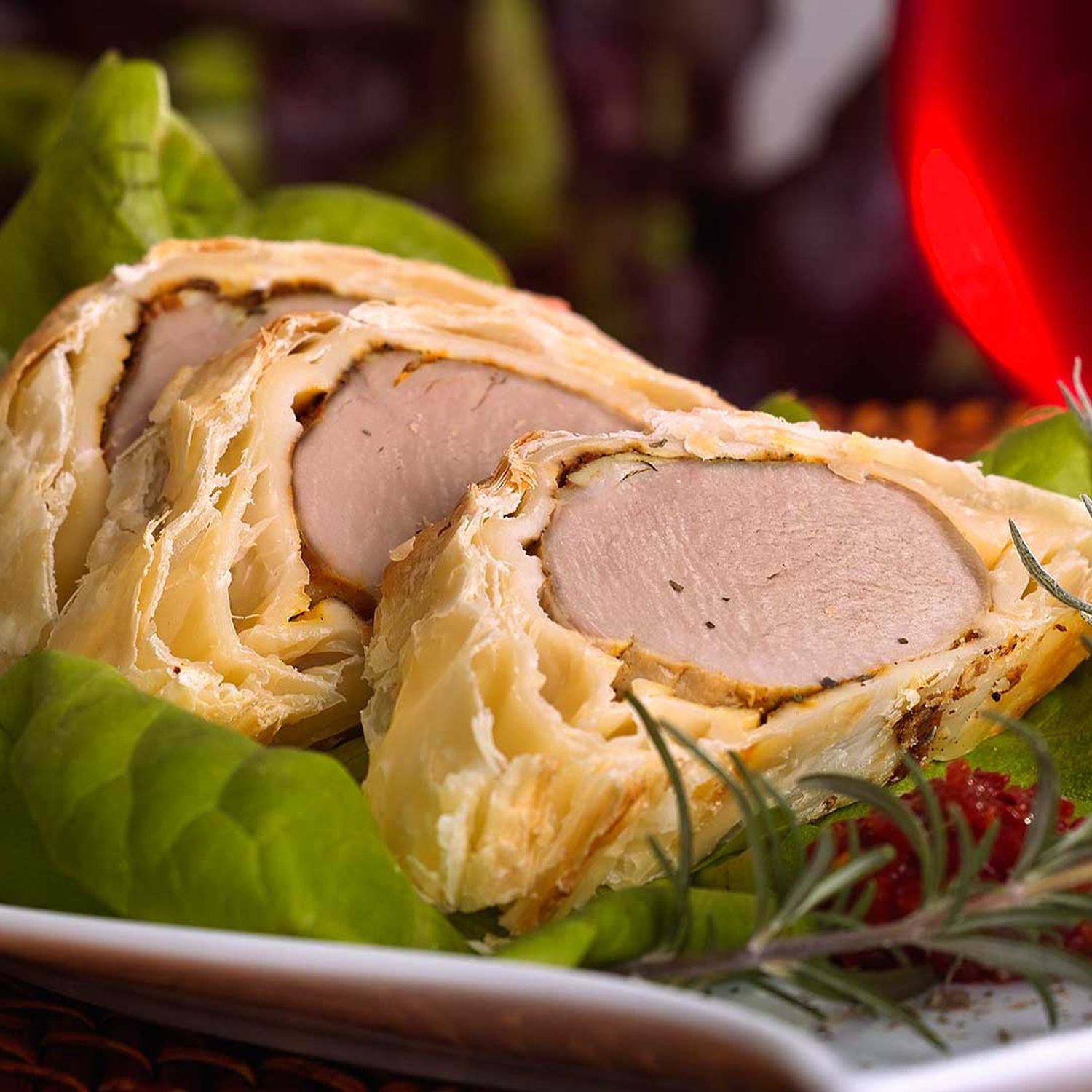 Schweinefilets im Blätterteig, Kräutersauce und Kürbisrisotto