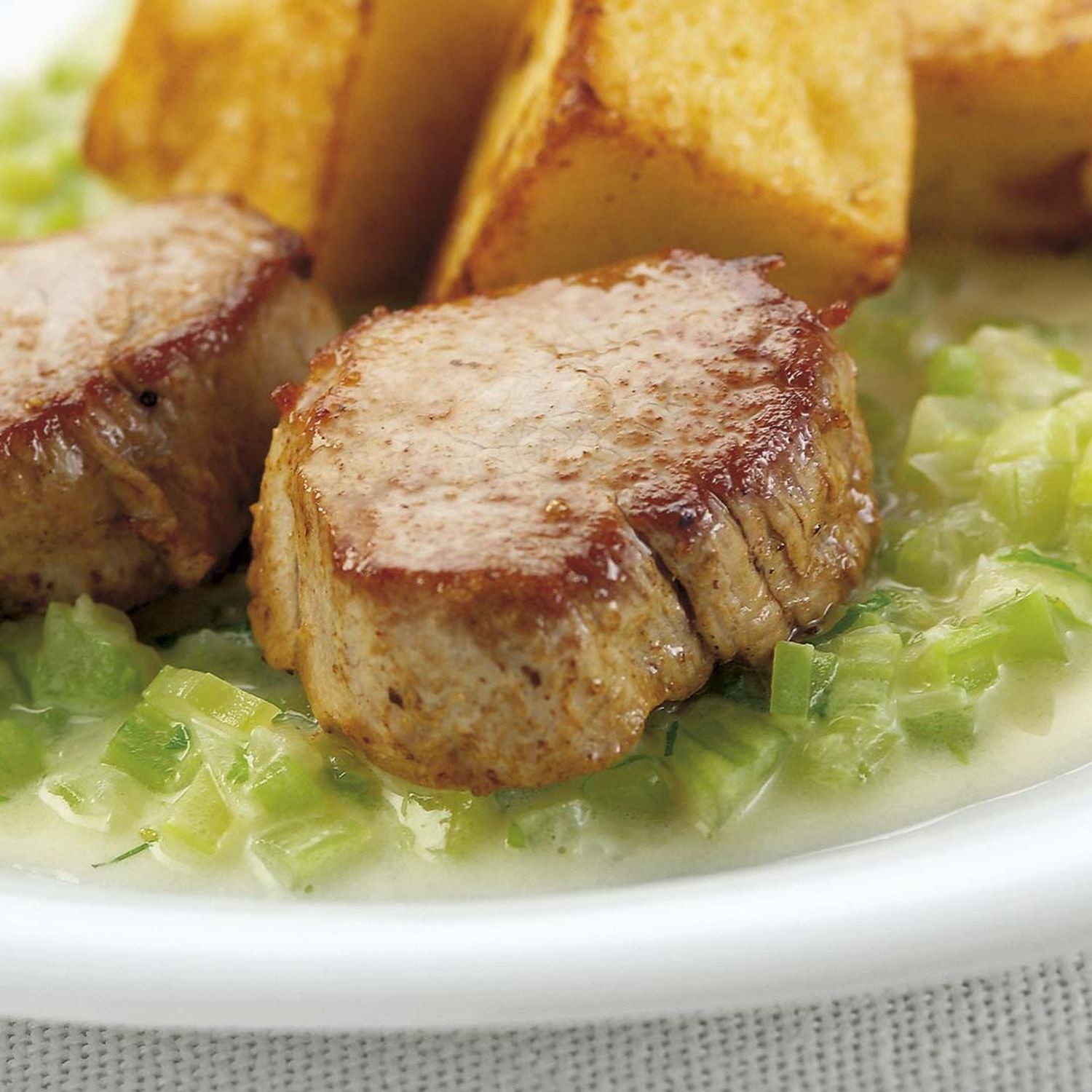 Schweinesteaks mit eingemachtem Sellerie und Semmelschmarrn