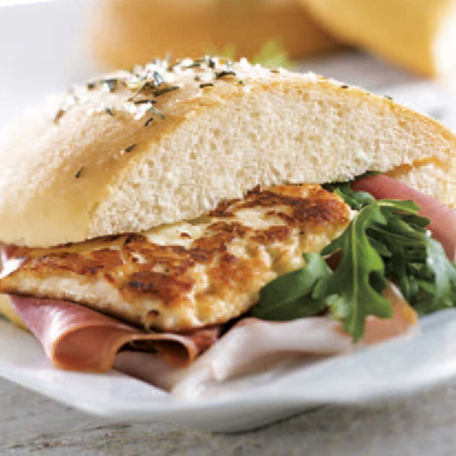 Rucola waschen, gut abtropfen lassen und mit geriebenem Parmesan verfeinern. Mit Balsamico-Essig und Olivenöl beträufeln und vorsichtig verrühren. Halloumi in ca. 5 mm dicke Scheiben schneiden, in Olivenöl braten und mit Oregano würzen. Zum Schluss in die noch warmen Focaccias eine Tasche schneiden und mit Rohschinken, Rucolasalat und Halloumi füllen.