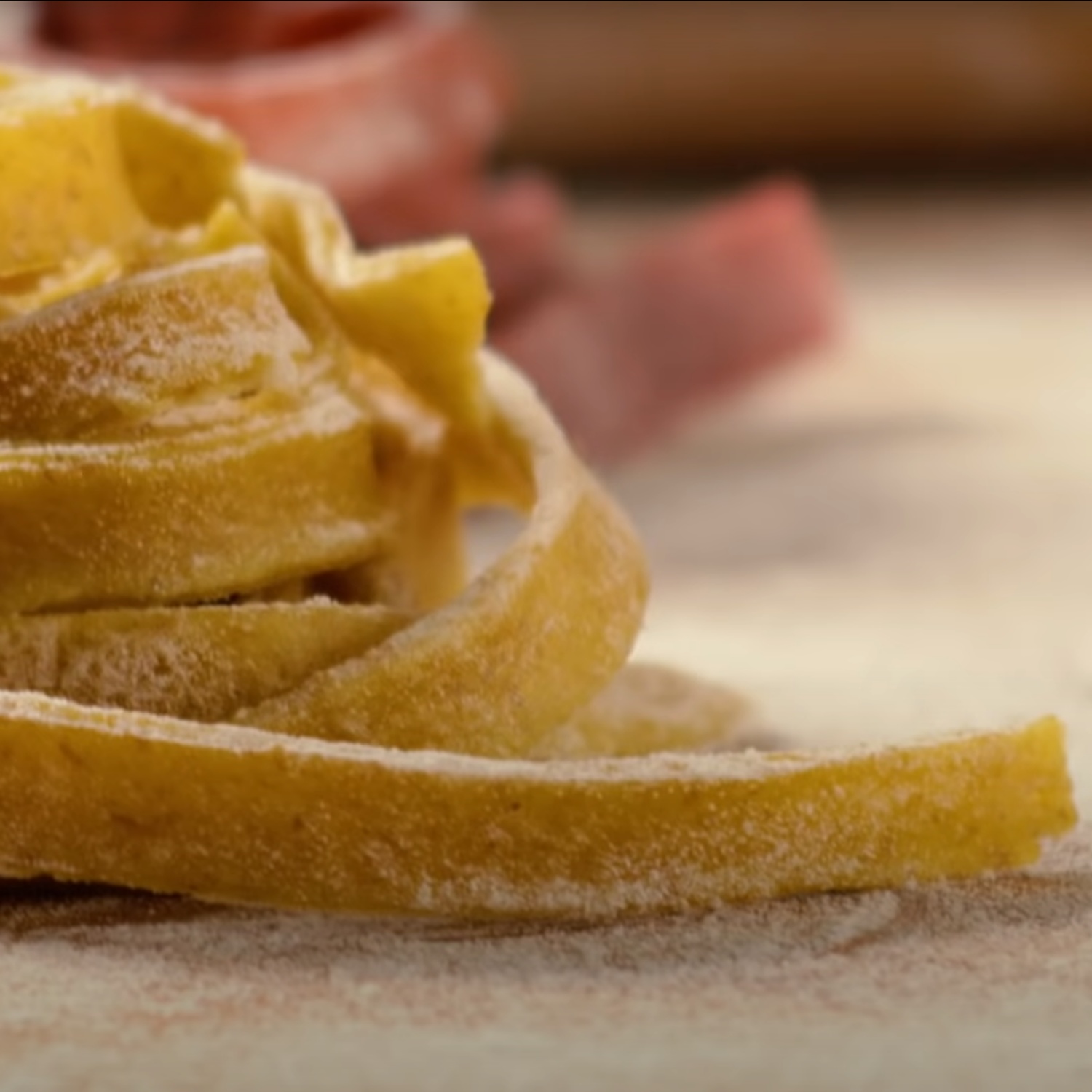 4. Die Teigteile mit einem Nudelholz oder einer Pastamaschine auf 2 Millimeter Dicke ausrollen. Teig in Streifen schneiden. Fertig sind die Bandnudeln.