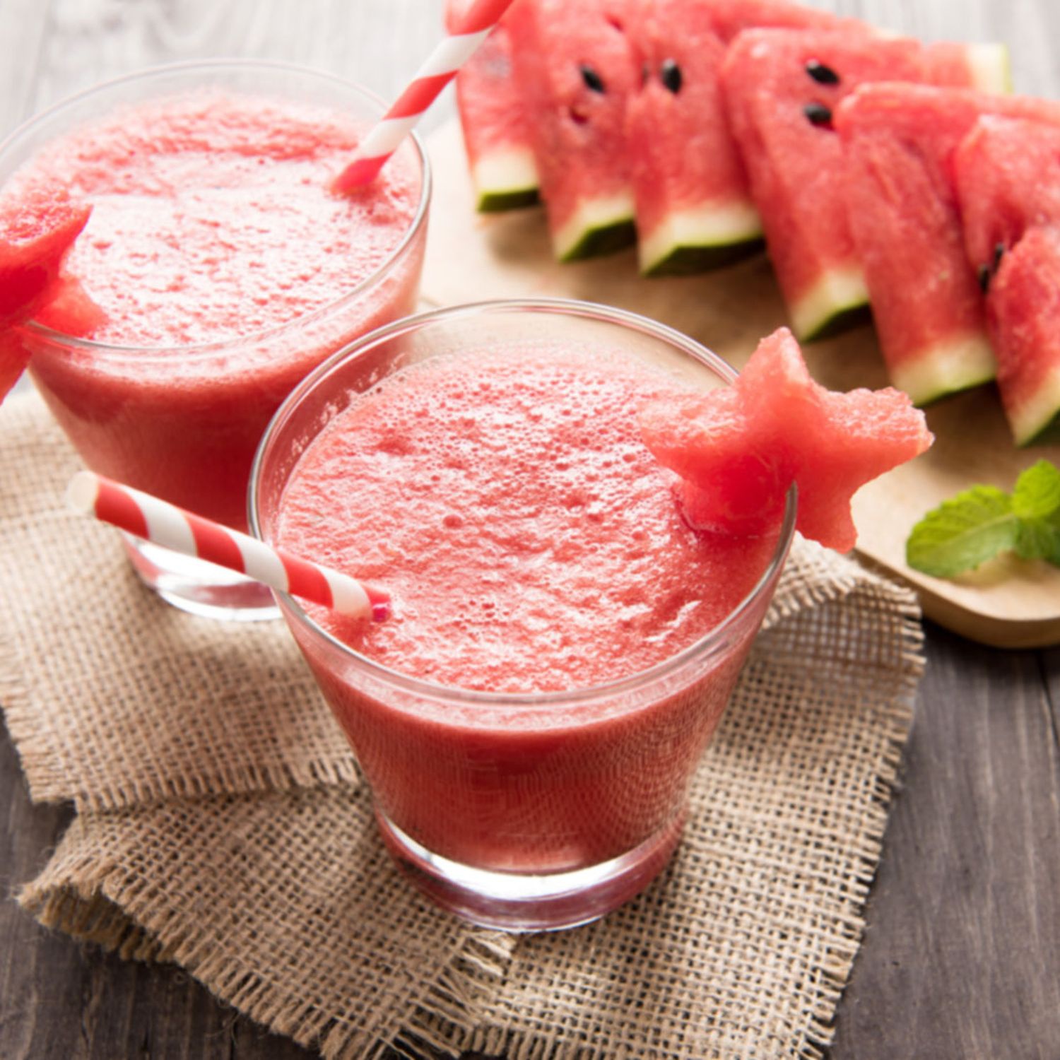In Gläser füllen, mit Melonenspalten und Erdbeeren verzieren und mit Strohhalm servieren.