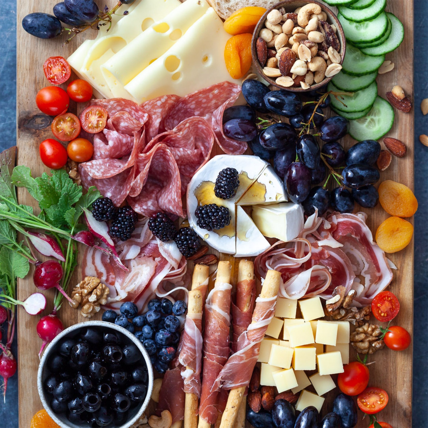 Die restlichen Zutaten auf dem Brett anrichten und mit frischem Brot oder Baguette servieren.