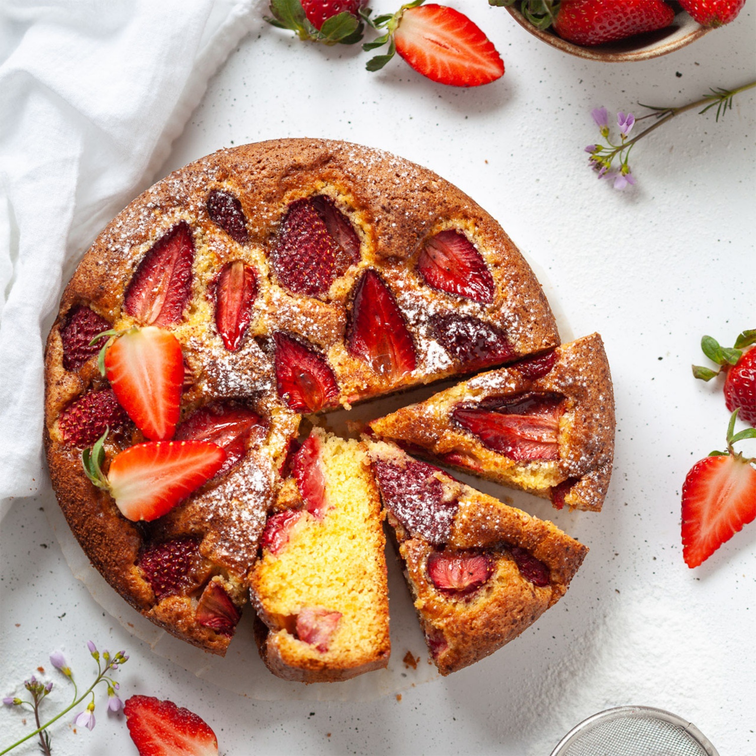 Schnell, einfach und köstlich: unser sommerlicher Kuchen mit versunkenen Erdbeeren ist der ideale Begleiter zum Nachmittags-Kaffee!