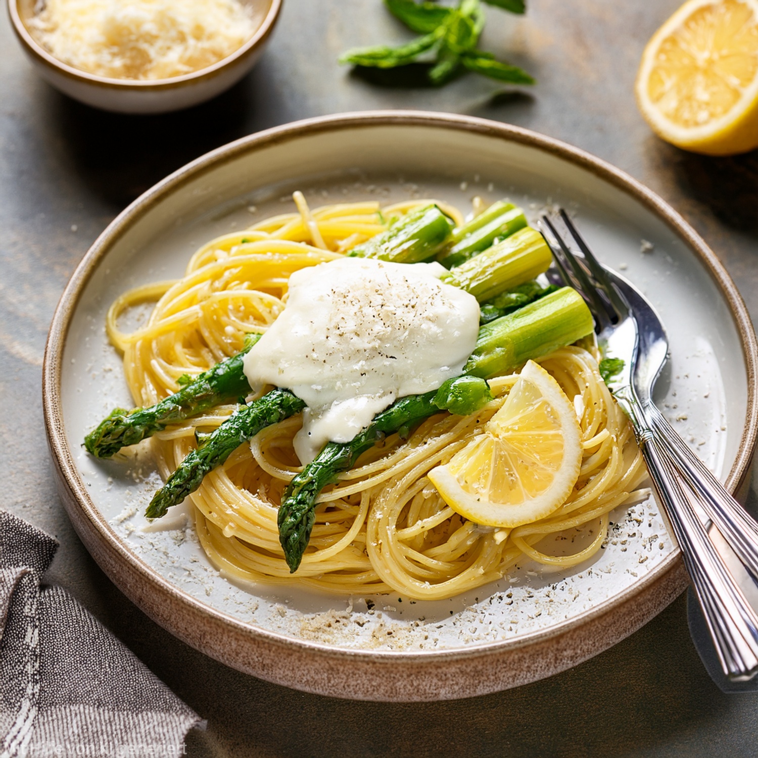 7. Die Zitronen-Ricotta-Sauce über die Spaghetti und den Spargel gießen und alles gut vermengen.