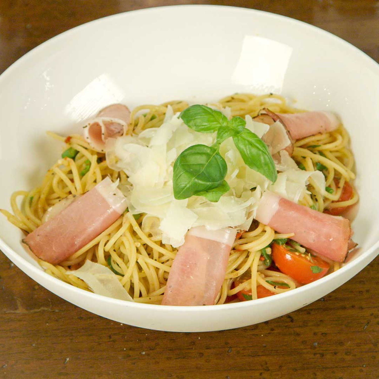 Die Nudeln auf warmen Pastatellern anrichten, mit etwas Olivenöl beträufeln und etwas Parmesan darübe reiben. Die Speckscheiben zu Röllchen formen und die Nudeln damit belegen. Mit den Basilikumblättern dekorieren.