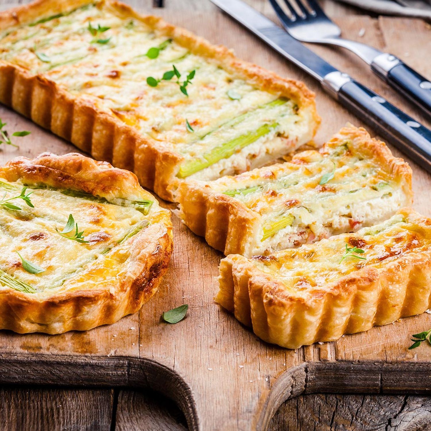 Spargel schälen und die unteren Enden abschneiden. Spargelstangen quer halbieren und in leicht gesalzenem Wasser 3 Minuten kochen. Dann herausnehmen und in einem Sieb abtropfen lassen. Backofen auf 180 °C Umluft (200 °C Ober-/Unterhitze) vorheizen. Dann eine 28 cm breite und 4,5 cm tiefe Tarteform einfetten. Den Teig ausrollen und die Form damit auskleiden.