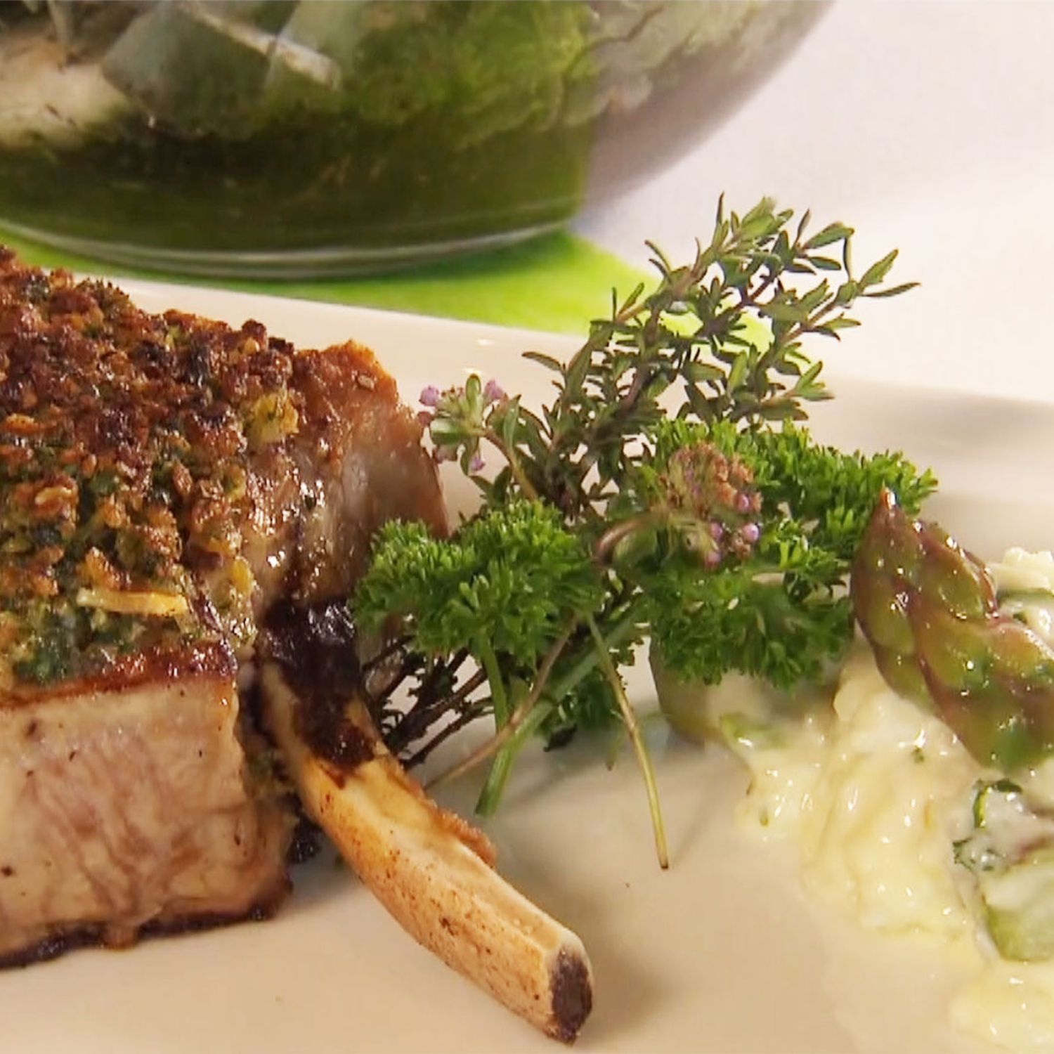Spargelrisotto mit rosa gebratener Kalbskrone