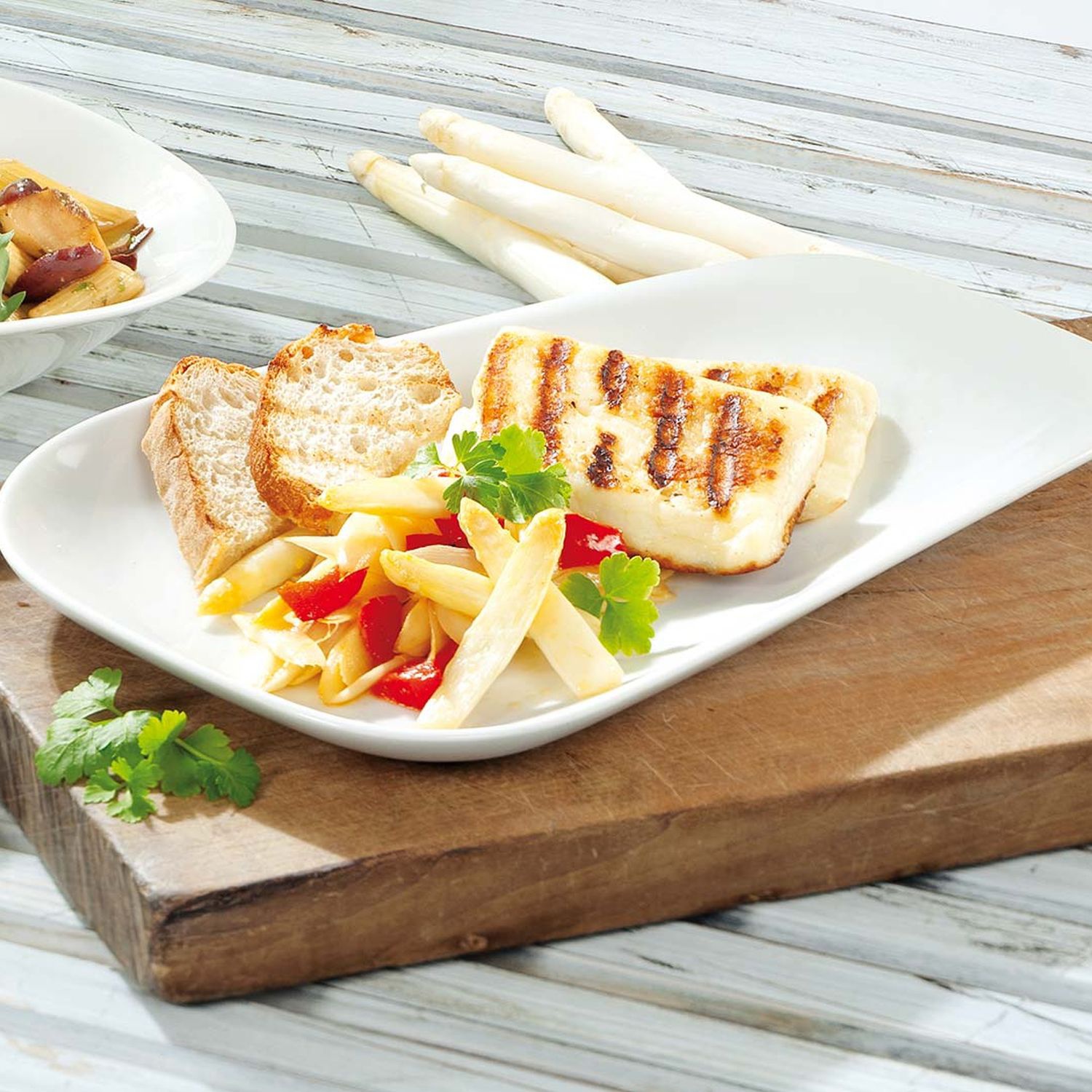 Spargelsalat mit Halloumi-Käse und etwas getoastetem Weißbrot servieren.
