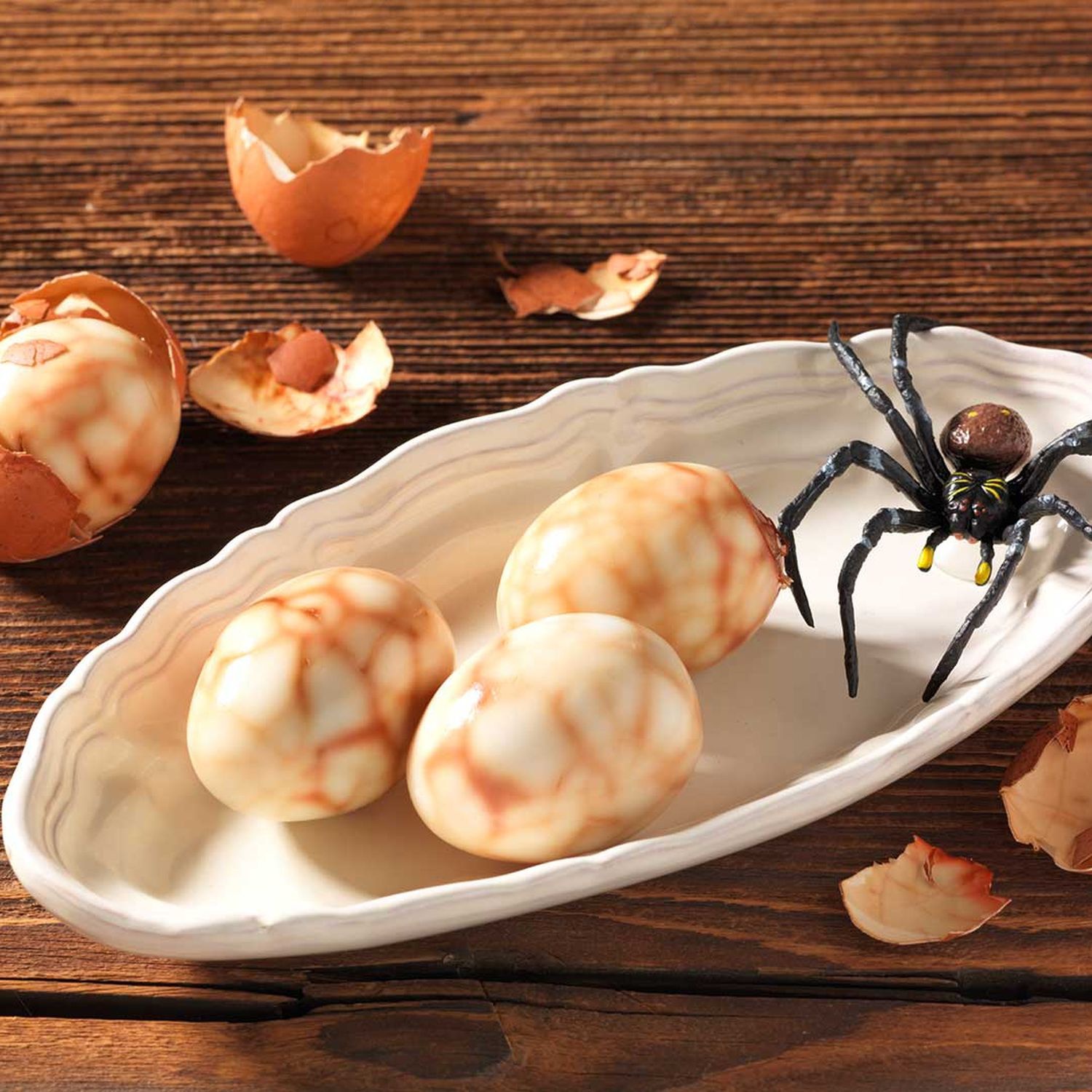 Die Spinneneier können beim Kochvorgang beliebig gefärbt werden. Dazu nimmt man Lebensmittelfarbe und lässt die Sojasoße weg.