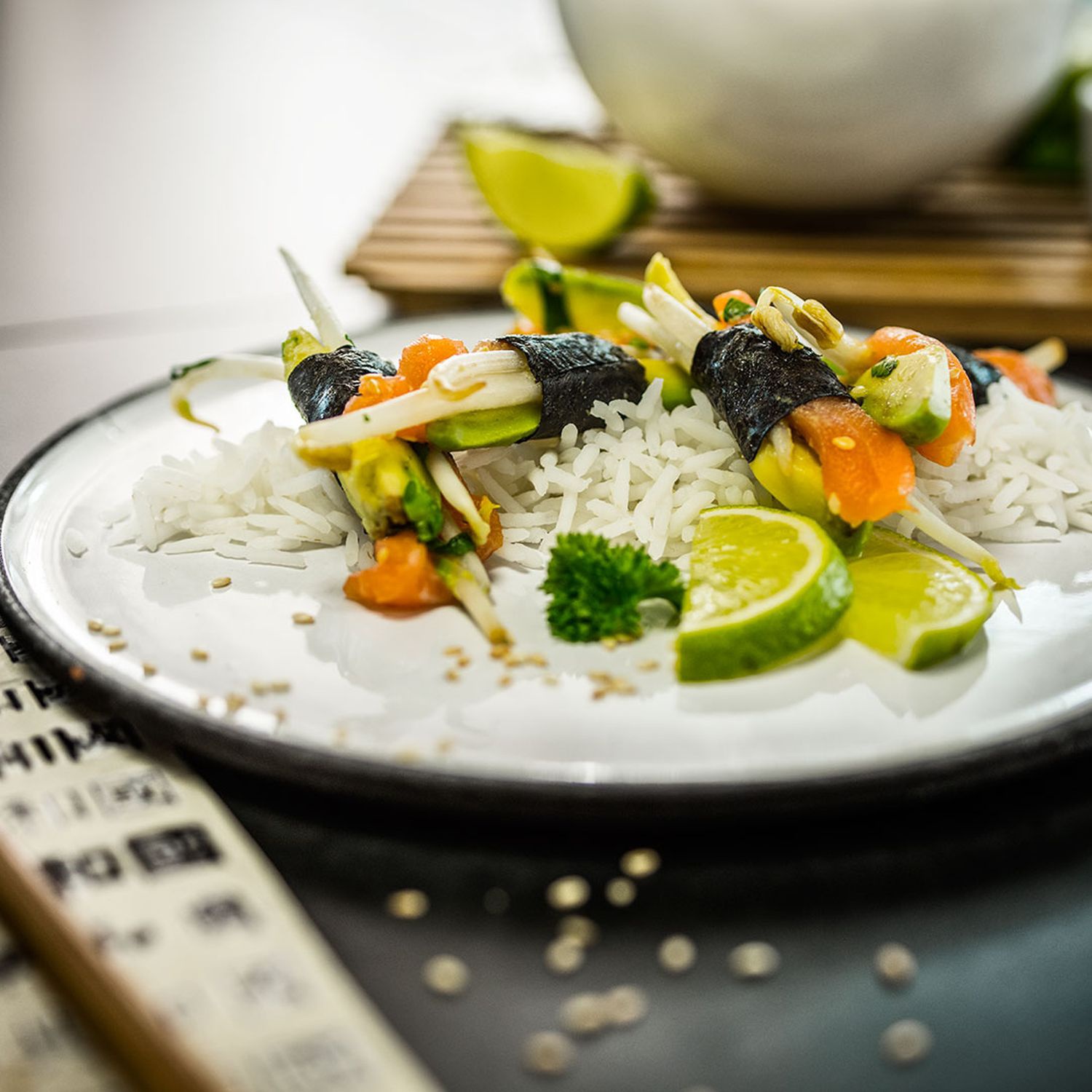 Das Algenblatt mit einer Schere in 2 cm breite und 5 cm lange Streifen schneiden. Nun den Lachs, die Avocados und die Sprossen auf das Algenblatt legen und dieses zu einer Rolle drehen und servieren.