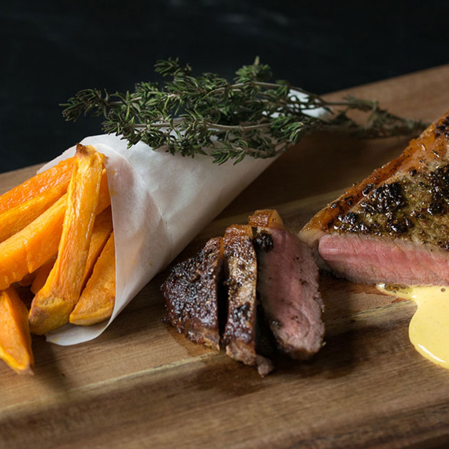 Während die Steaks ruhen, die Süßkartoffel schälen und in fingerdicke Streifen schneiden. Die Sticks auf ein, mit Backpapier ausgelegtes, Backblech verteilen und mit dem Olivenöl beträufeln.