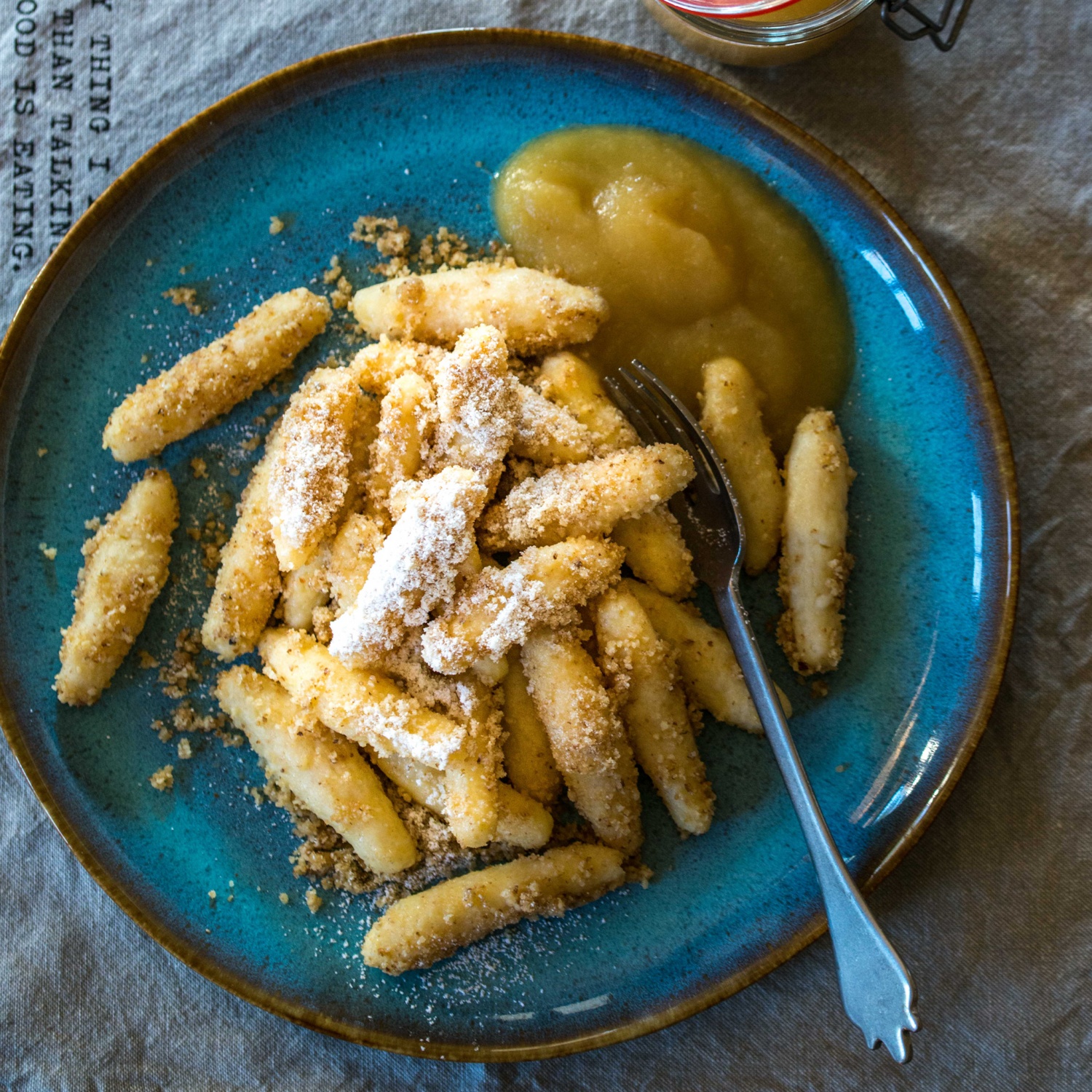 In einem großen Topf Wasser zum Kochen bringen und die Nudeln mit einem Knödelheber vorsichtig einlegen. Die Nudeln bei niedriger Hitze leicht sieden lassen. Sobald die Nudeln auf der Wasseroberfläche schwimmen, aus dem Wasser heben. In dem Nuss-Brösel-Gemisch wälzen, mit Staubzucker bestäuben und mit Apfelmus anrichten.