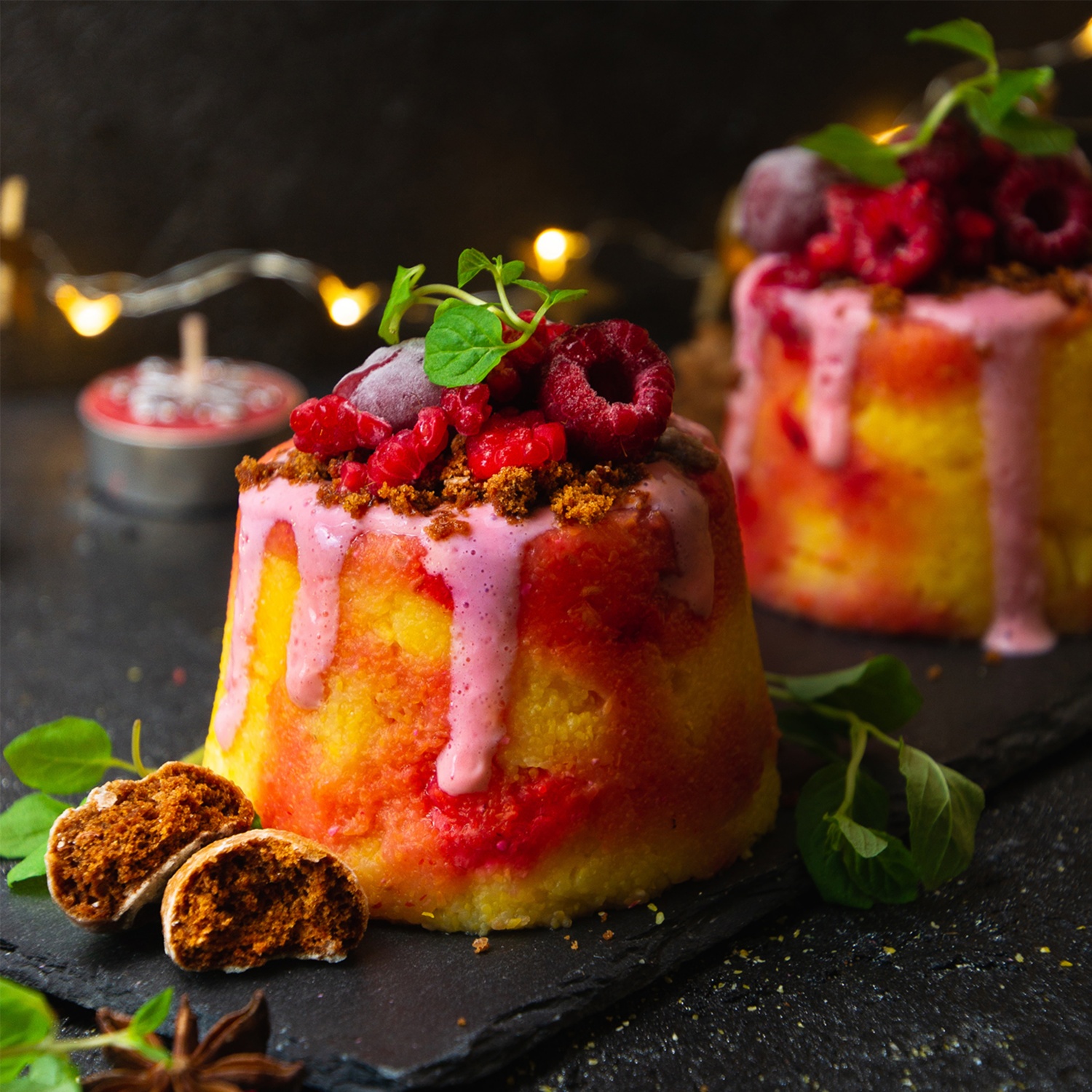 Am nächsten Morgen können die Polentaküchlein aus dem Glas auf einen Teller gestürzt werden und mit dem Lebkuchen-Crumble, dem Obst und etwas frischer Minze garniert werden. Wer will kann das Ganze natürlich auch direkt aus dem Glas verspeisen.