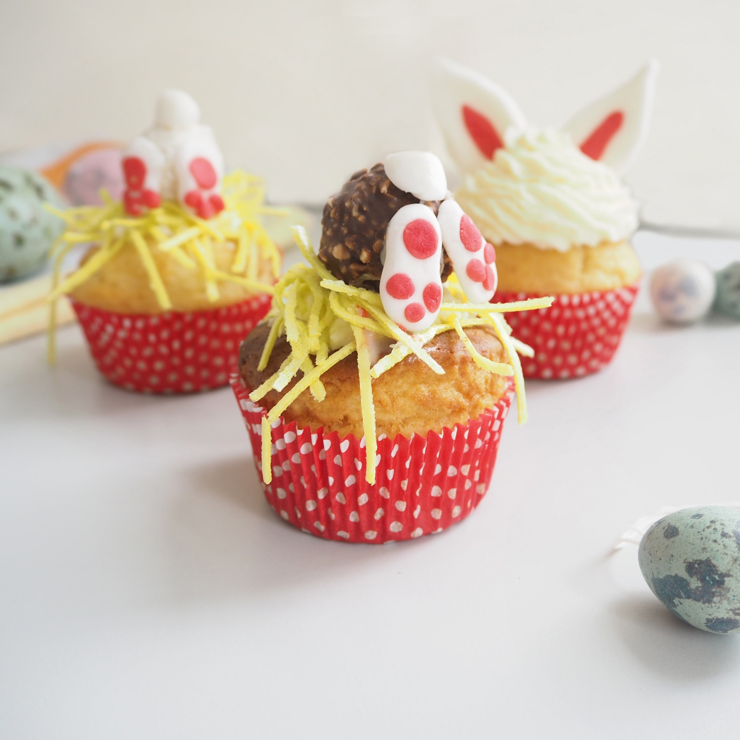 Die Cupcakes mit den Pralinen und etwas Ostergras dekorieren und die Hasen-Füße und -Ohren anbringen.