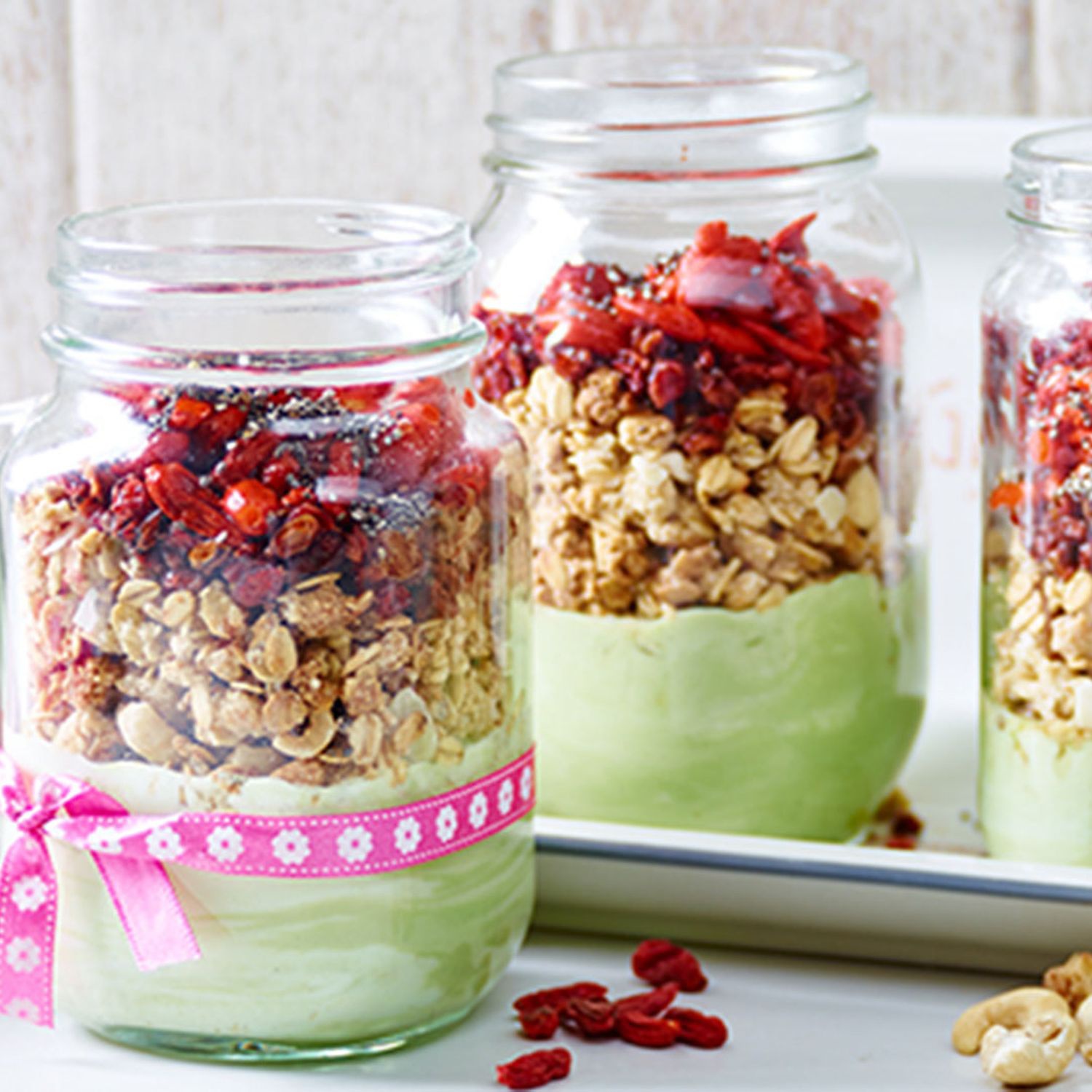 Goji-Beeren und Berberitzen etwa 30 Minuten in etwas warmem Wasser quellen lassen. Das Matcha-Joghurt mit Basis-Müsli und Chia-Samen mischen.