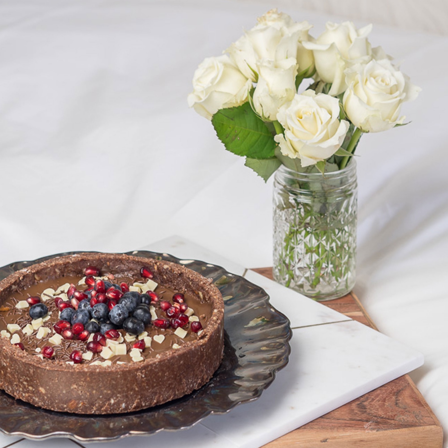 Nach etwa 2 Stunden im Kühlschrank kann die Schokoladen-Torte noch verziert werden. Dafür weiteres Superfood in Form von Granatapfelkernen und Heidelbeeren verwenden – ein paar Schokostreusel dürfen natürlich auch nicht fehlen.