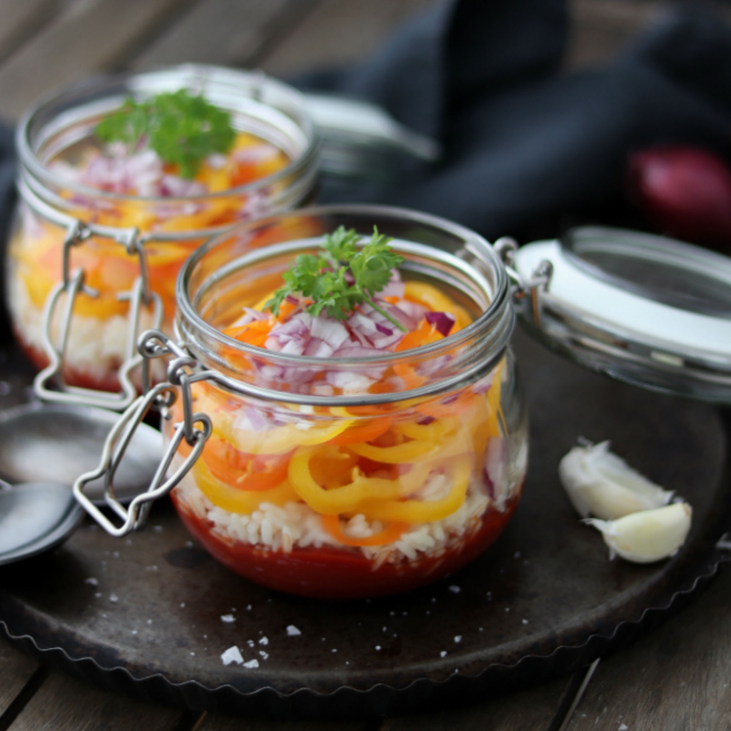Nun geht es ans Schichten in Gefäßen nach Wahl. Zuerst die Tomatensoße auf zwei Gefäße aufteilen. Dann kommt der ausgekühlte Reis (sollte der Reis noch warm sein, die Gefäße einfach leicht geöffnet in den Kühlschrank stellen.) Anschließend Paprika, Zwiebel und etwas Petersilie in die Gefäße geben und bis zum Verzehr kaltstellen.