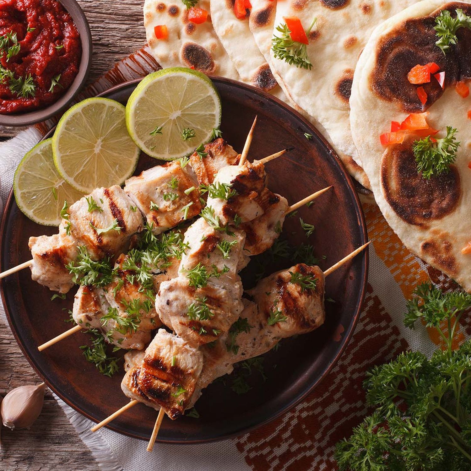 Tandoori-Joghurt-Spieße auf indischem Fladenbrot