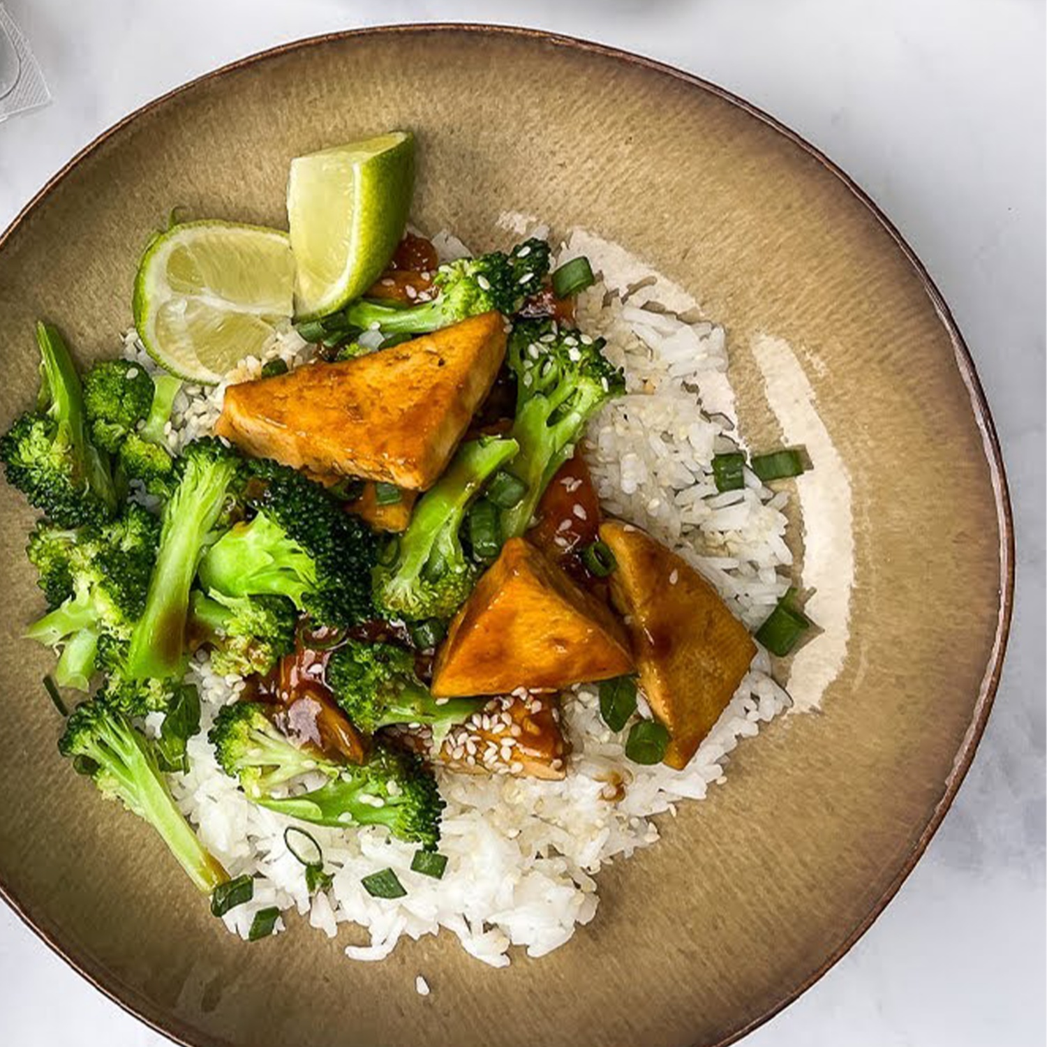 Den Tofu mit Brokkoli und Reis servieren. Etwas Sesam und gehackte Frühlingszwiebel darüber streuen.