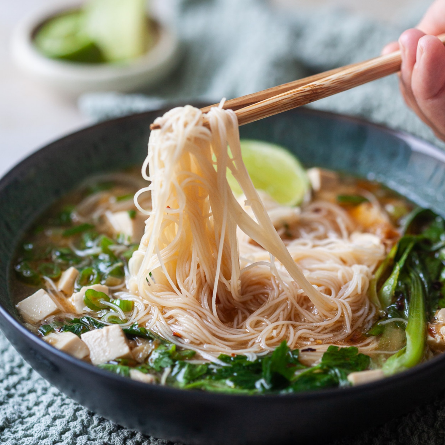 Diese Thai-Nudelsuppe ist ein schnelles und geschmackvolles Gericht für die perfekte Abwechslung. Die Kombination aus Knoblauch, Ingwer, Chili und frischen Kräutern erzeugt eine duftende und köstliche Brühe. Tofu und Reisnudeln sorgen für Herzhaftigkeit, während Pak Choi und Frühlingszwiebel Frische und Knusprigkeit bieten.