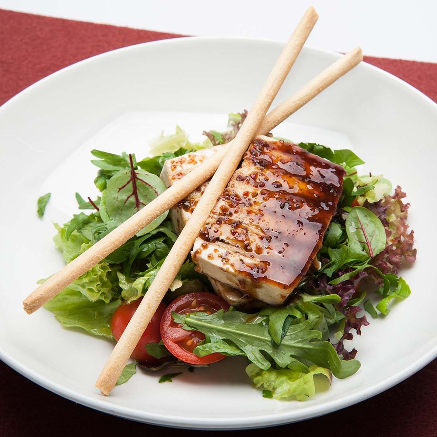 Tofu in Gewürzglasur auf buntem Salat und Grissini
