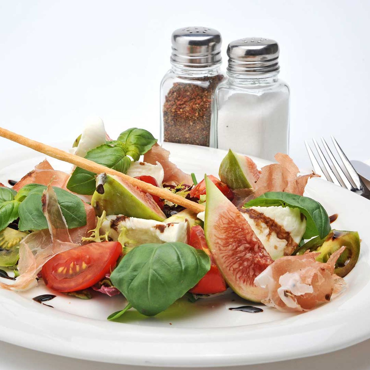 Tomaten und Mozzarella mit bunten Salatblättchen auf Tellern anrichten. Mit Balsamico und Olivenöl beträufeln und mit Tomaten-Mozzarella-Salz würzen. Mit den Feigenspalten, den Schinkenscheiben, den Basilikumblättern und den Grissini garnieren.
