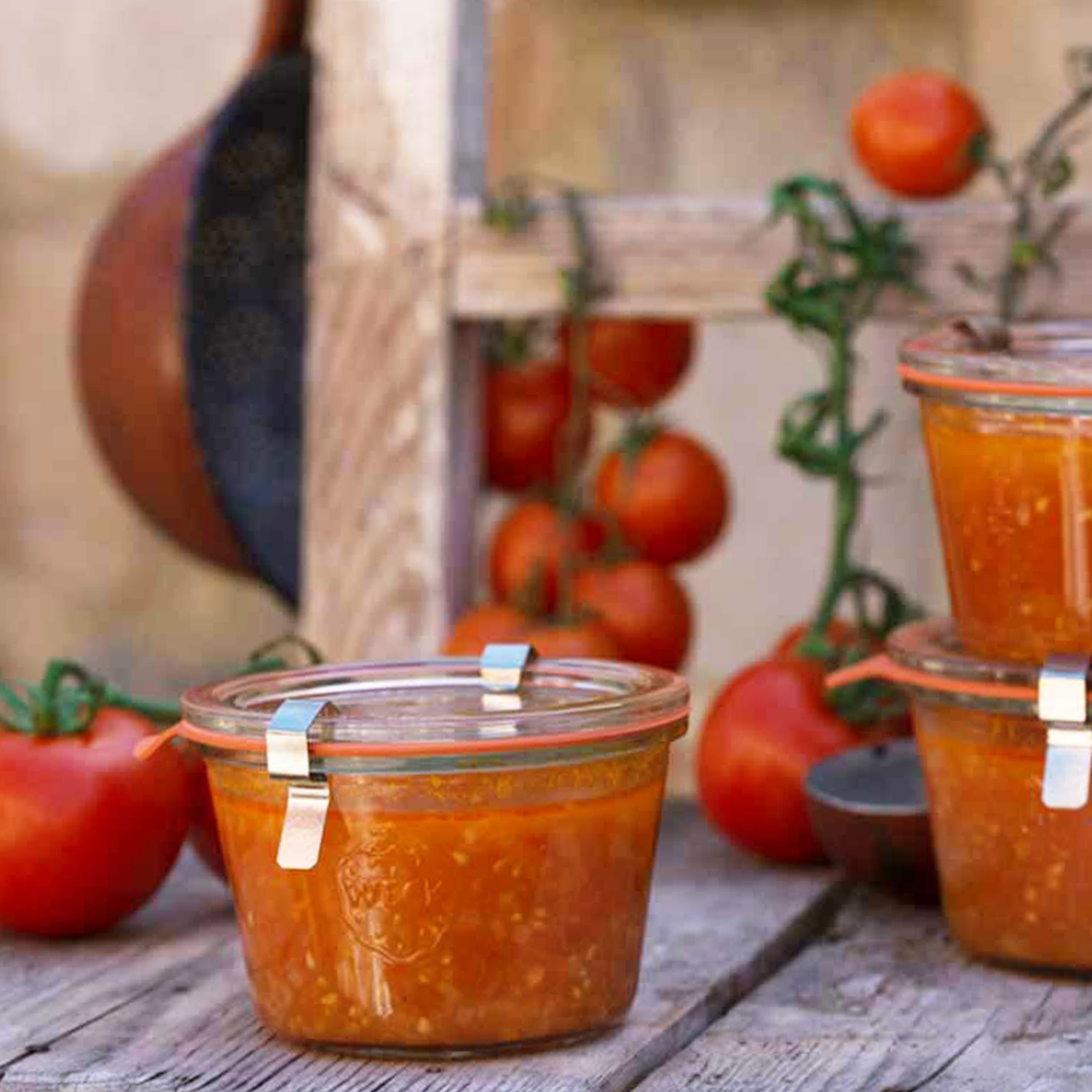 Sternanis entfernen und die Paradeiser nun kochend heiß in die sterilisierten Einmachgläser abfüllen, mit Gummi und Glasdeckel verschließen und mit den Klammern fixieren. Erkalten lassen. Erst dann die Klammern entfernen.