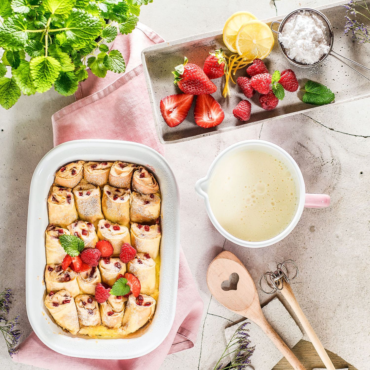 1. Die Milch, das Obers, die Eier, den Zucker und den Vanillezucker verrühren und über die Palatschinken gießen.