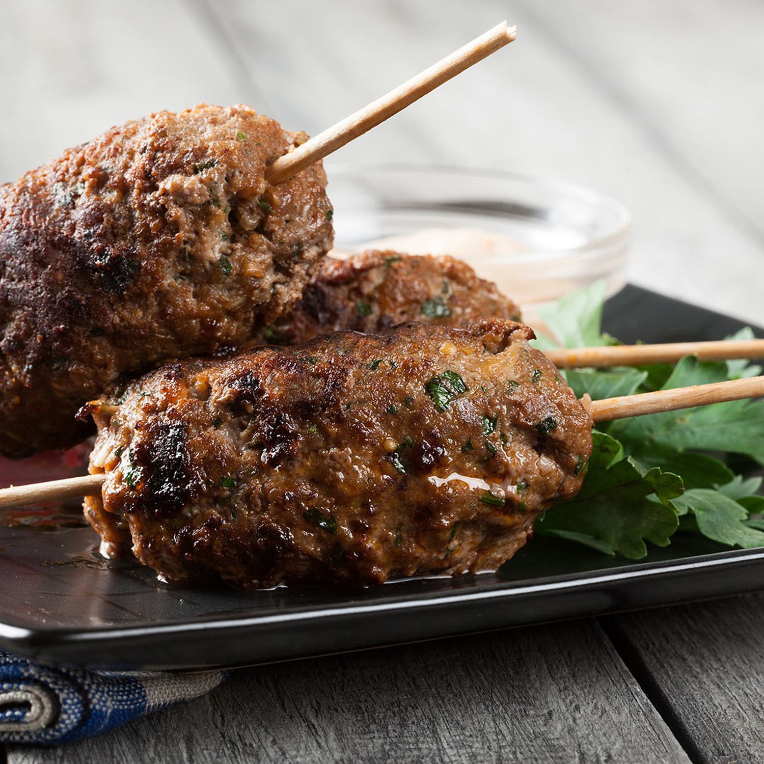 Zwiebel und Knoblauch schälen und fein würfeln. Petersilie waschen und fein hacken. Faschiertes mit Petersilie, Zwiebel-, Knoblauchwürfeln und Haferflocken vermischen und mit Salz und Pfeffer würzen. Die Masse zu kleinen Laibchen formen und auf Holzspieße stecken.