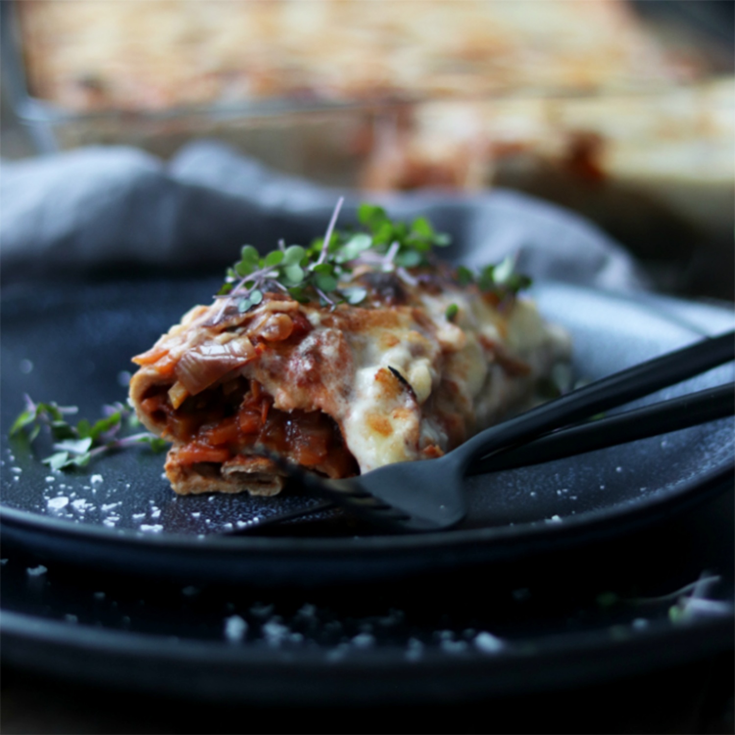Überbackene Dinkelpalatschinken mit Gemüsefüllung