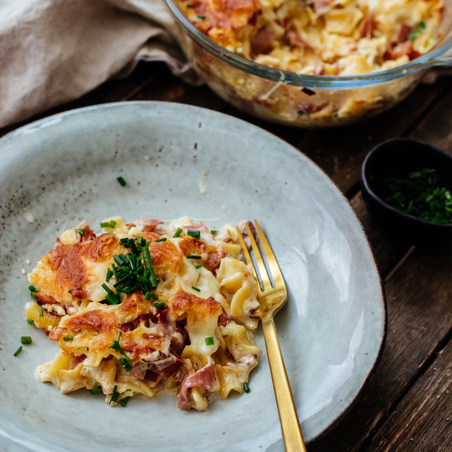 Den Backofen auf 180°C Ober-/Unterhitze vorheizen und die Schinkenfleckerl für ca. 20-25 Min backen, bis der Käse schön braun ist. Die fertigen überbackenen Schinkenfleckerl mit frisch gehacktem Schnittlauch garnieren und servieren.