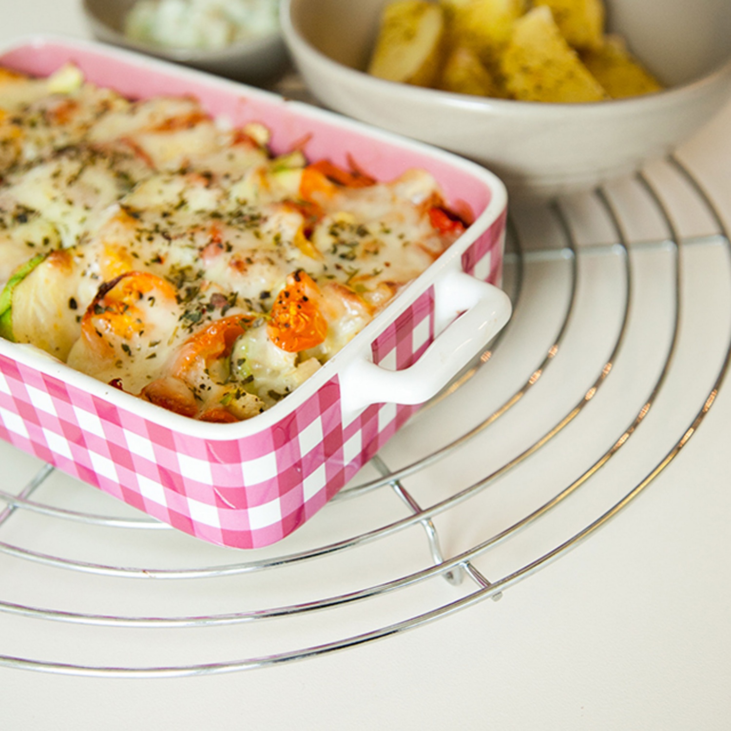 Die Auflaufform und die Kartoffeln gemeinsam bei 200° Celsius Ober-Unterhitze etwa 30 bis 35 Minuten ins Backrohr geben. Beide Gerichte lassen sich ideal gemeinsam zubereiten, das spart Zeit und Energie.
