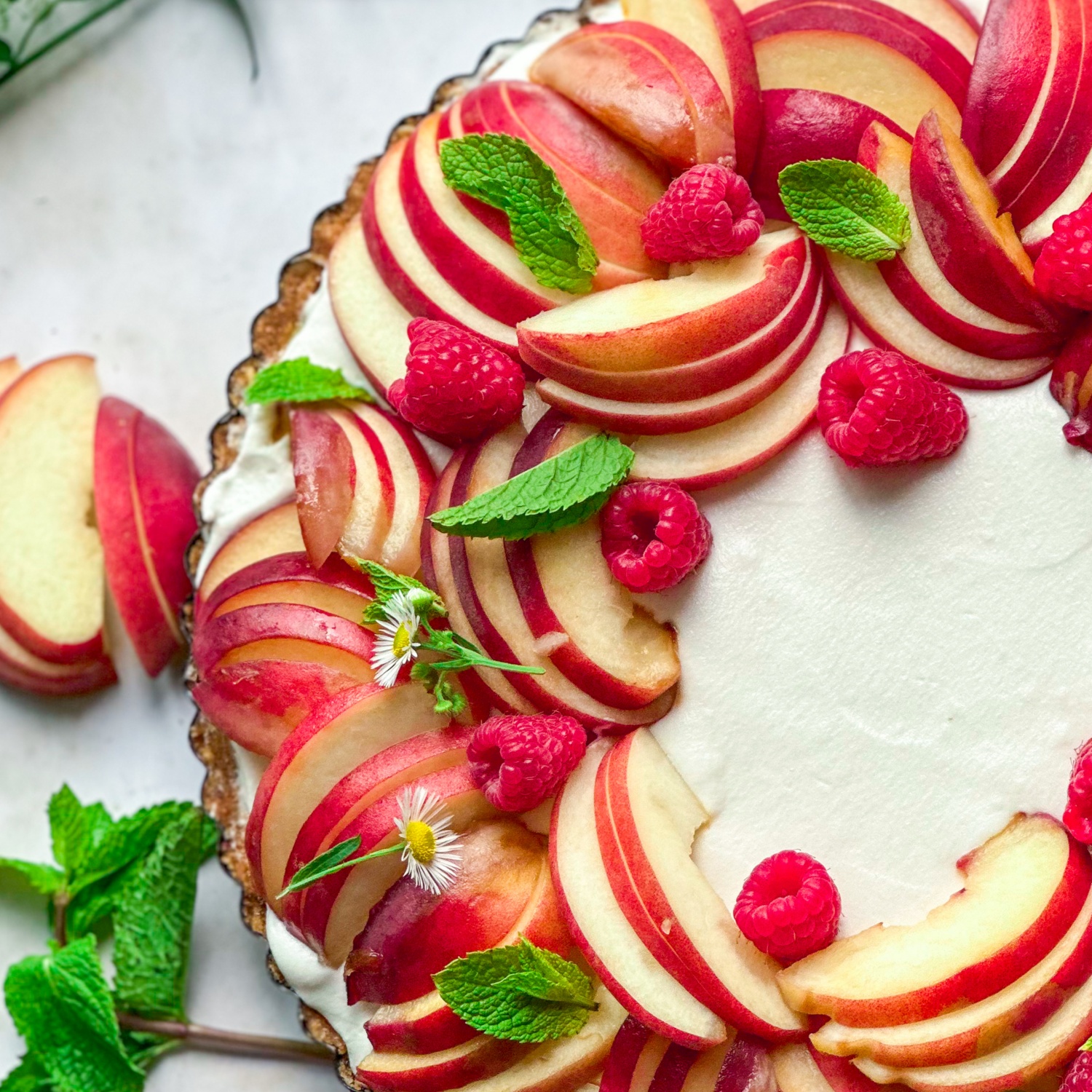 Für die Verzierung, den abgekühlten Kuchen mit geschlagener pflanzlicher Sahne, in Scheiben geschnittenen Pfirsichen, Himbeeren und Minzblättern dekorieren.