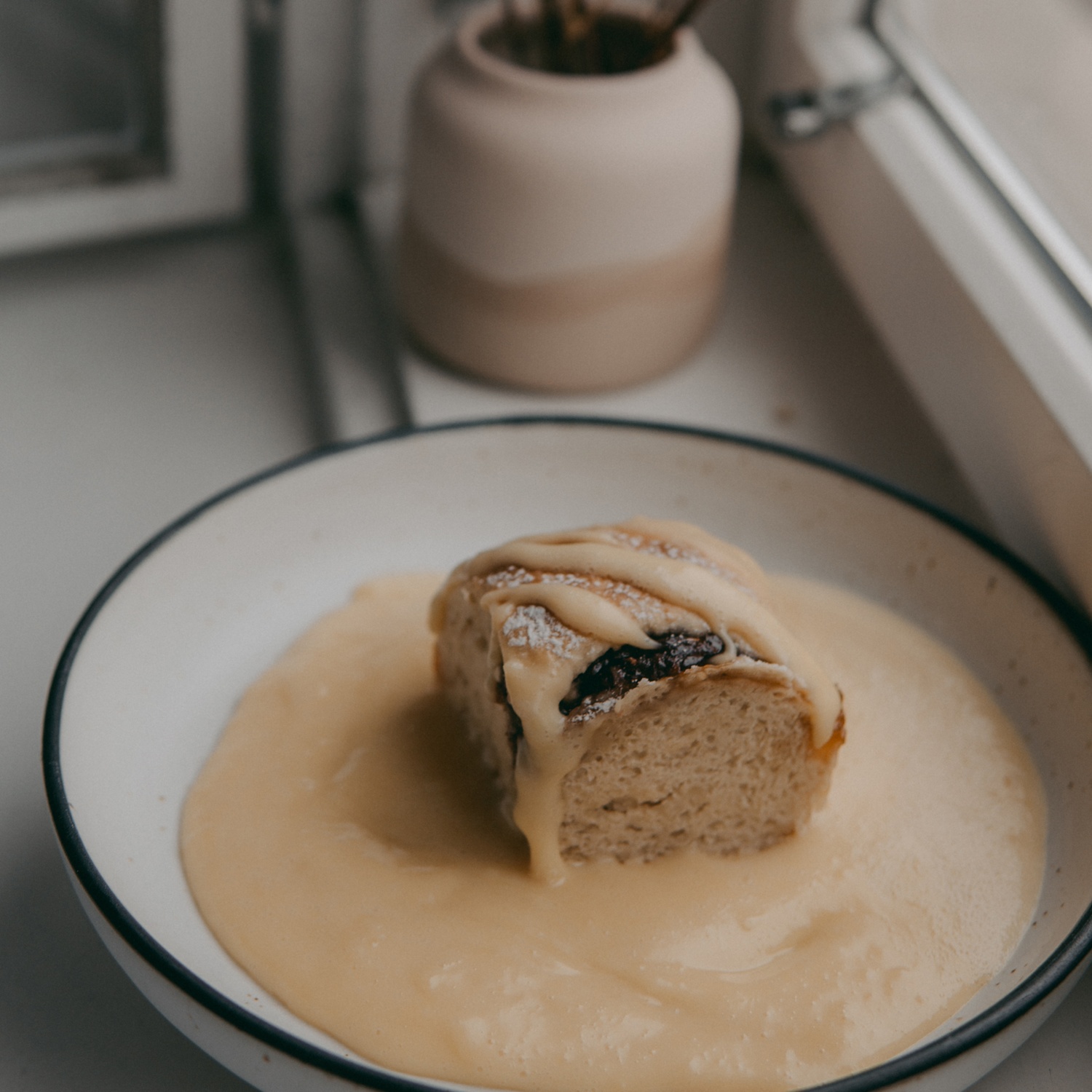 Abkühlen lassen und mit Staubzucker und veganer Vanillesauce garnieren.