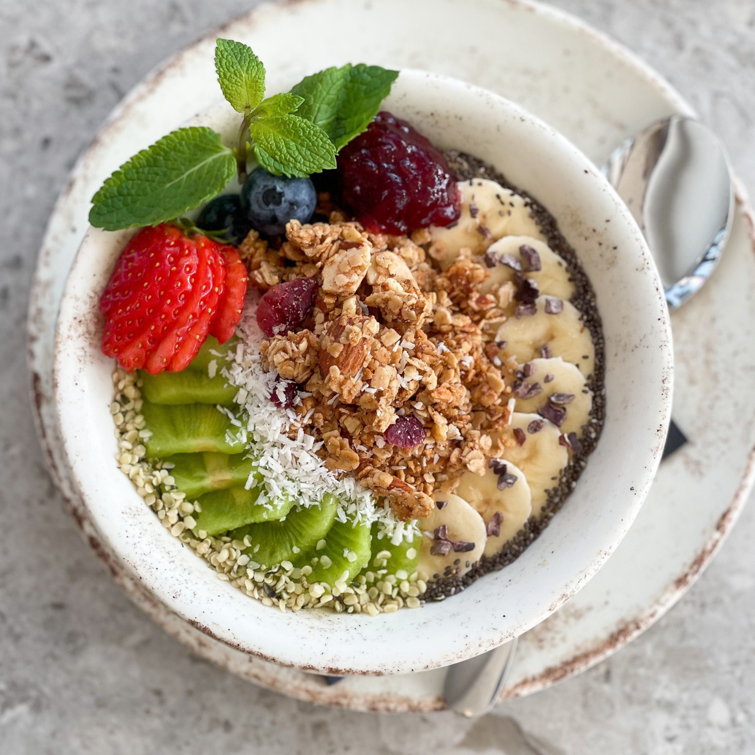 Das Joghurt in eine Schüssel geben und die restlichen Zutaten darauf verteilen.