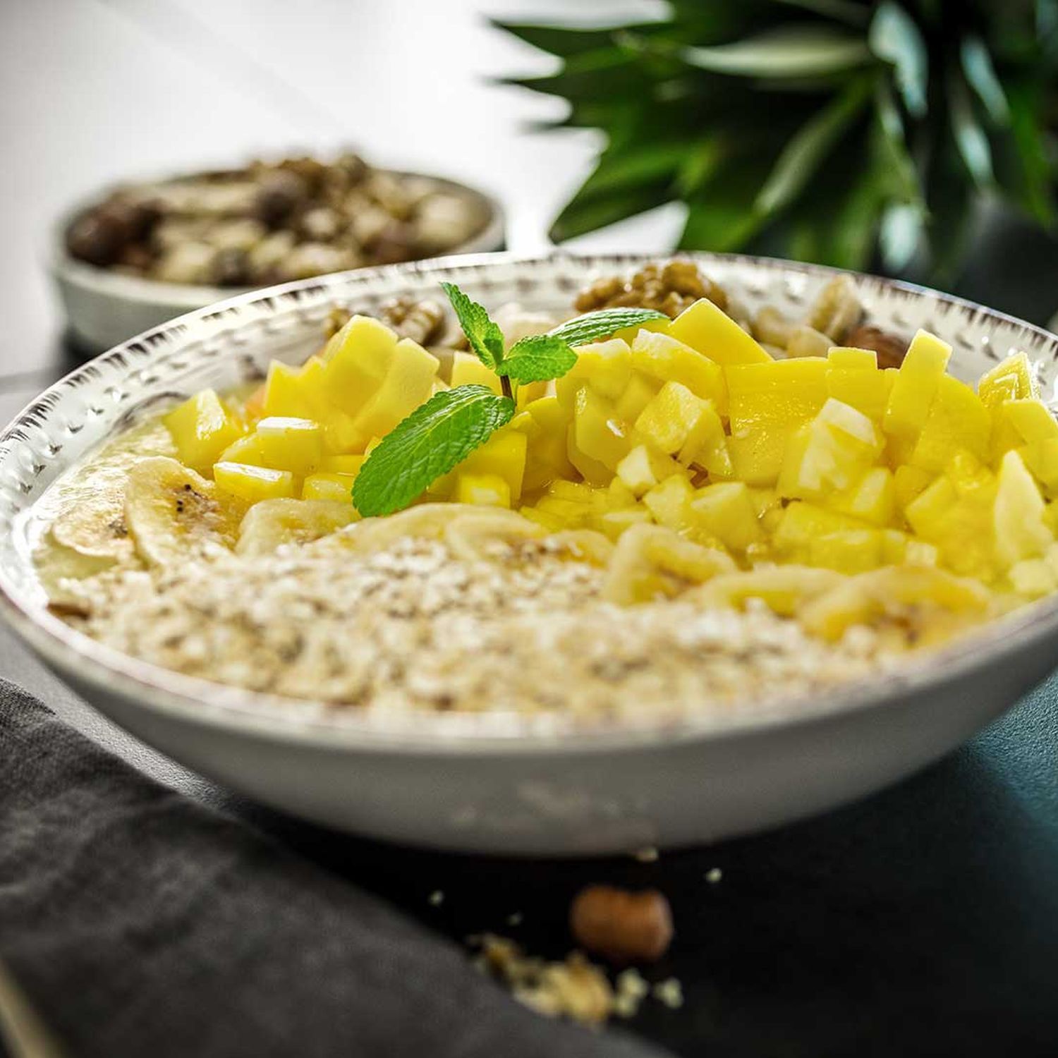 Mit Obst, getrockneten Bananen, Haferflocken und Nüssen garnieren.
