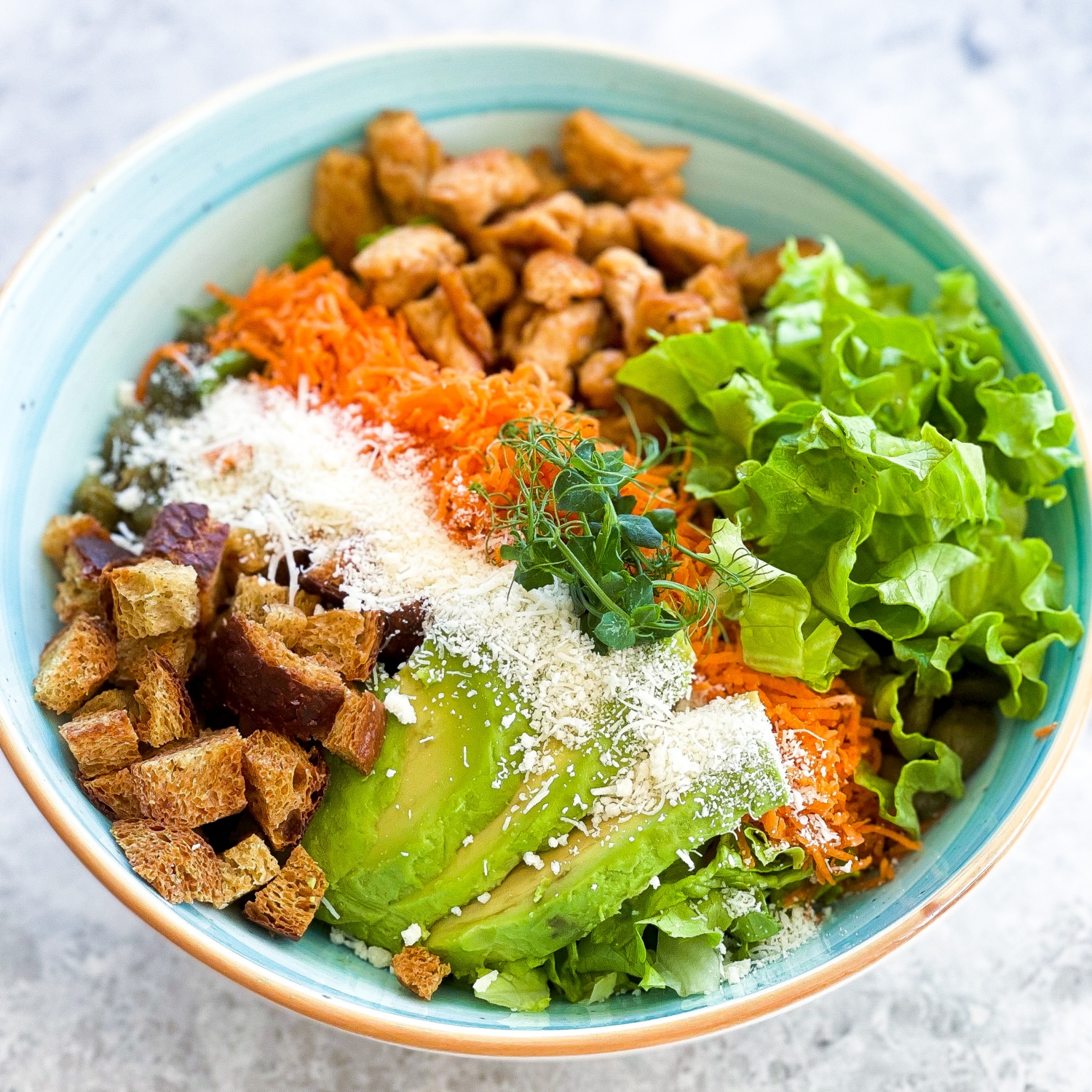 Karotten, Hühnerstreifen, Avocado, Kapern, Croutons und Parmesan in eine Schüssel geben, mit dem Dressing garnieren und anschließend servieren.