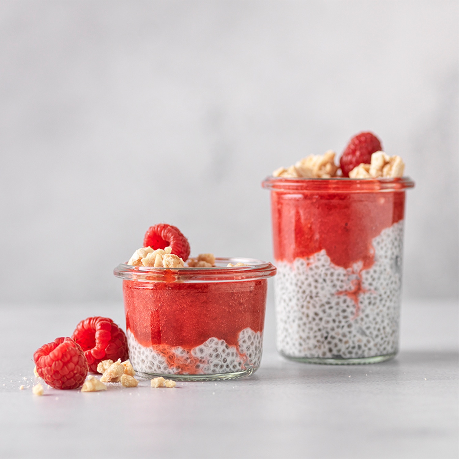 Chia-Pudding kräftig mit einem Schneebesen durchmischen und in kleine Schälchen füllen. Himbeerpüree auf dem Pudding verteilen.