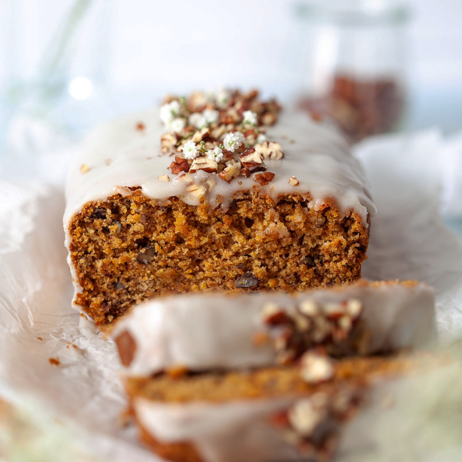 Für die Glasur Staubzucker mit Sojajoghurt und Zitronensaft vermischen. Die Glasur über den abgekühlten Kuchen gießen und mit gehackten Pekannüssen garnieren.
