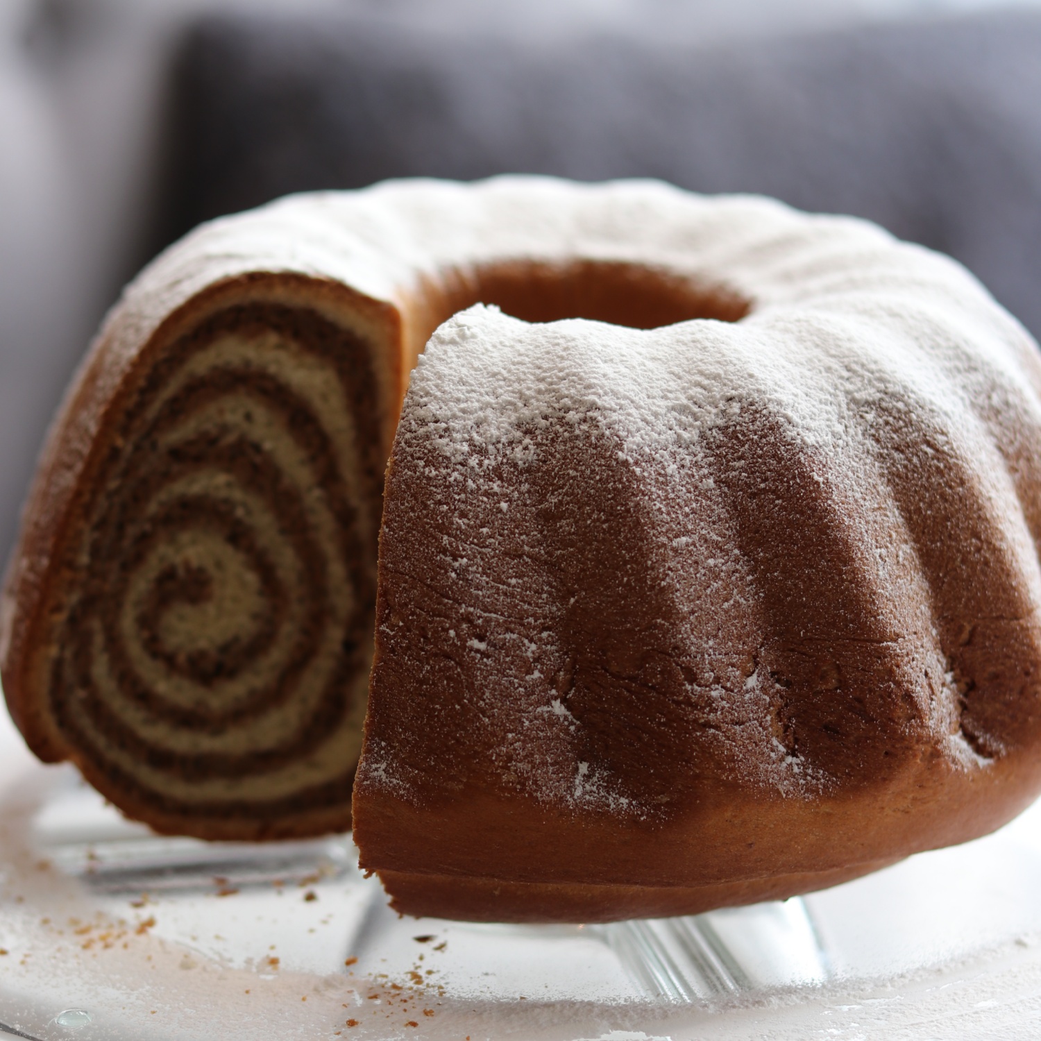 Gugelhupfform befetten und bestäuben. Die Teigrolle in die Form geben und mit einem Geschirrtuch abdecken. Die Form mit dem Kuchen nochmal für 20-30 Minuten an einem warmen Ort gehen lassen.