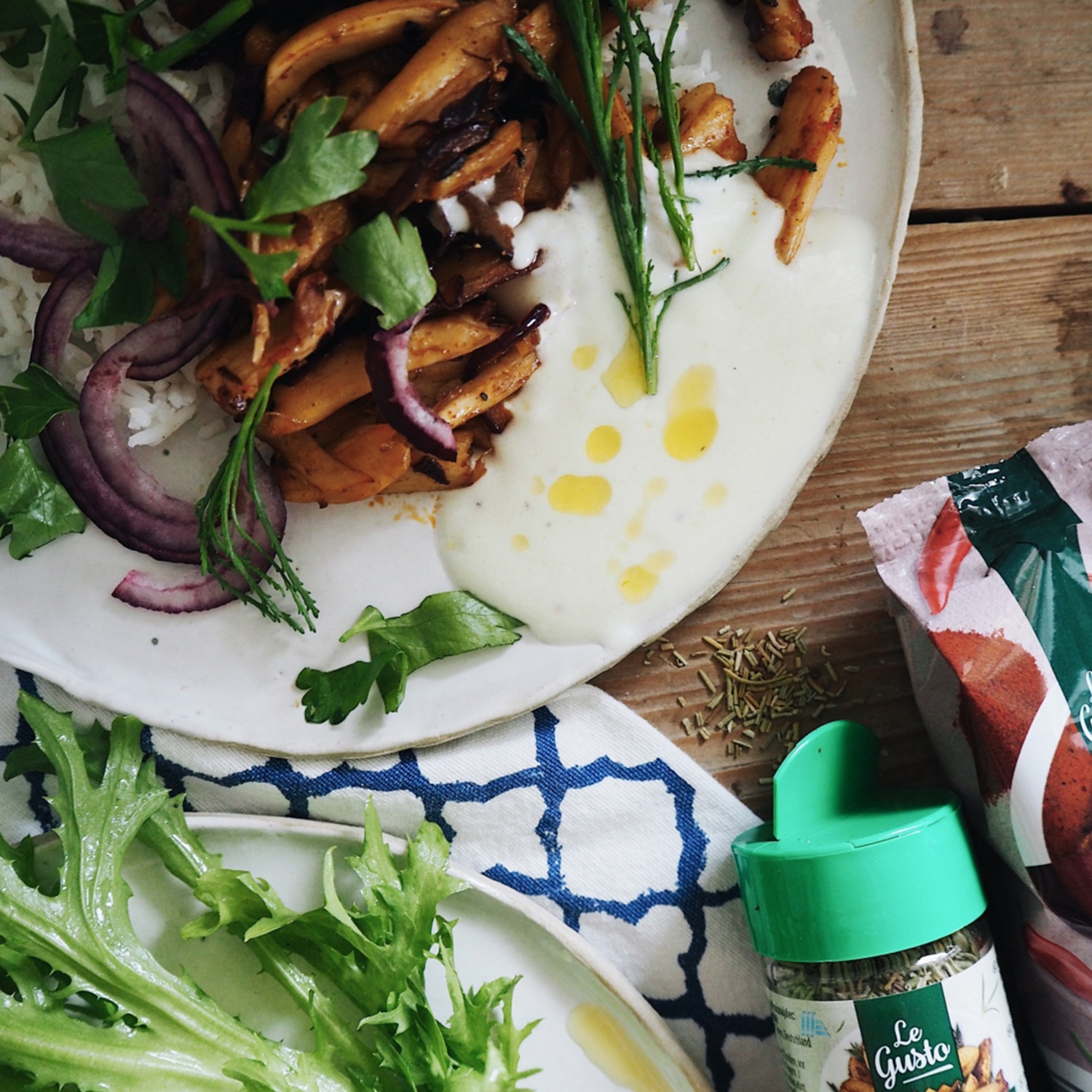 Für das Gyros die Kräuterseitlinge mit den Fingern grob zerrupfen. Die Zwiebel in dünne Ringe schneiden und eine Knoblauchzehe fein hacken. 1 EL Olivenöl in einer Pfanne erhitzen und Zwiebel und Knoblauch darin gut anbraten. Die Kräuterseitlinge zugeben und für ca. 7 Minuten scharf anbraten, bis alles gut gebräunt ist. Die Hitze zurückdrehen und die Gewürzmischung zugeben. Alles nochmal kurz braten lassen.