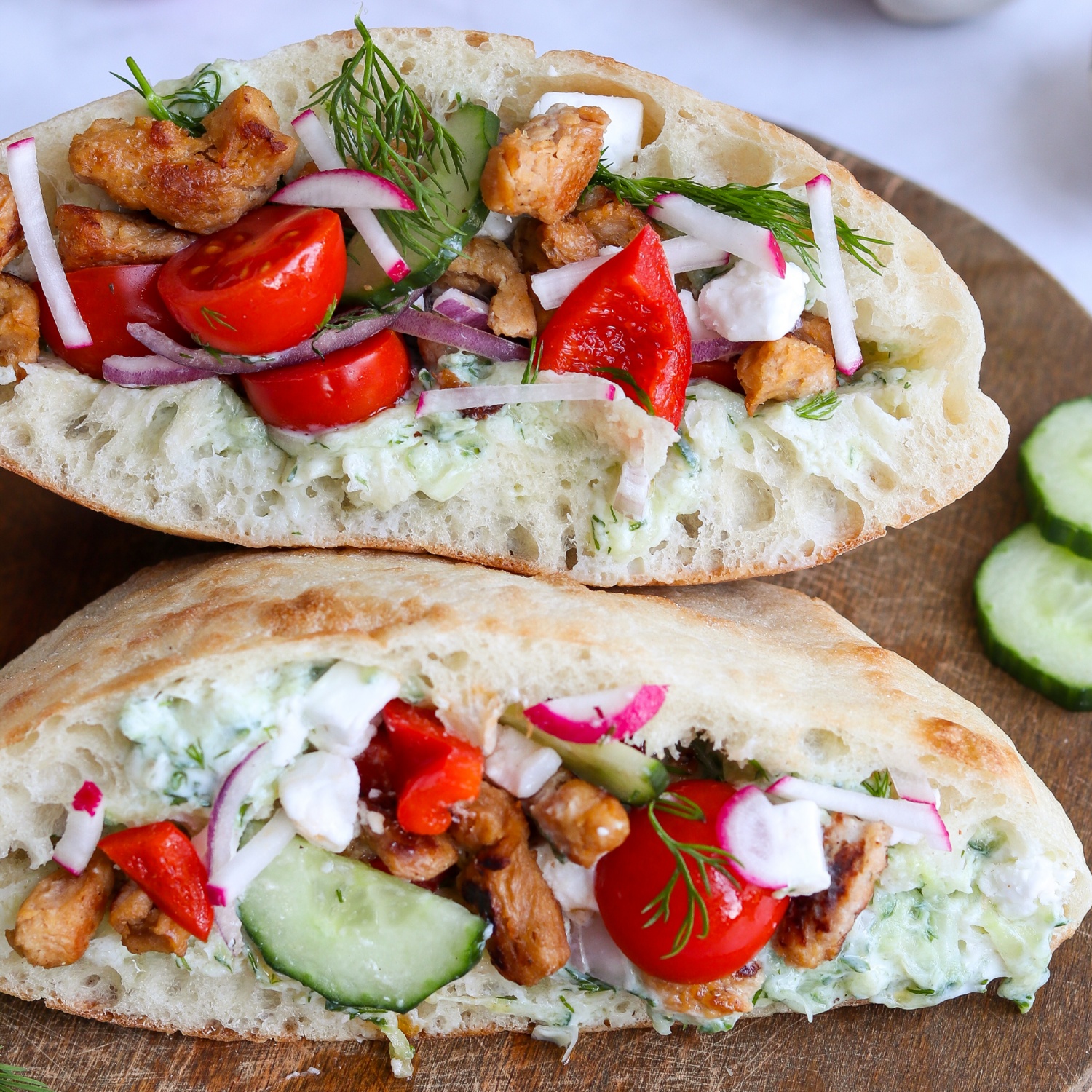 Das Pita Brot kurz erwärmen, mit Tzatziki bestreichen und die restlichen Zutaten auf dem Tzatziki verteilen und genießen!