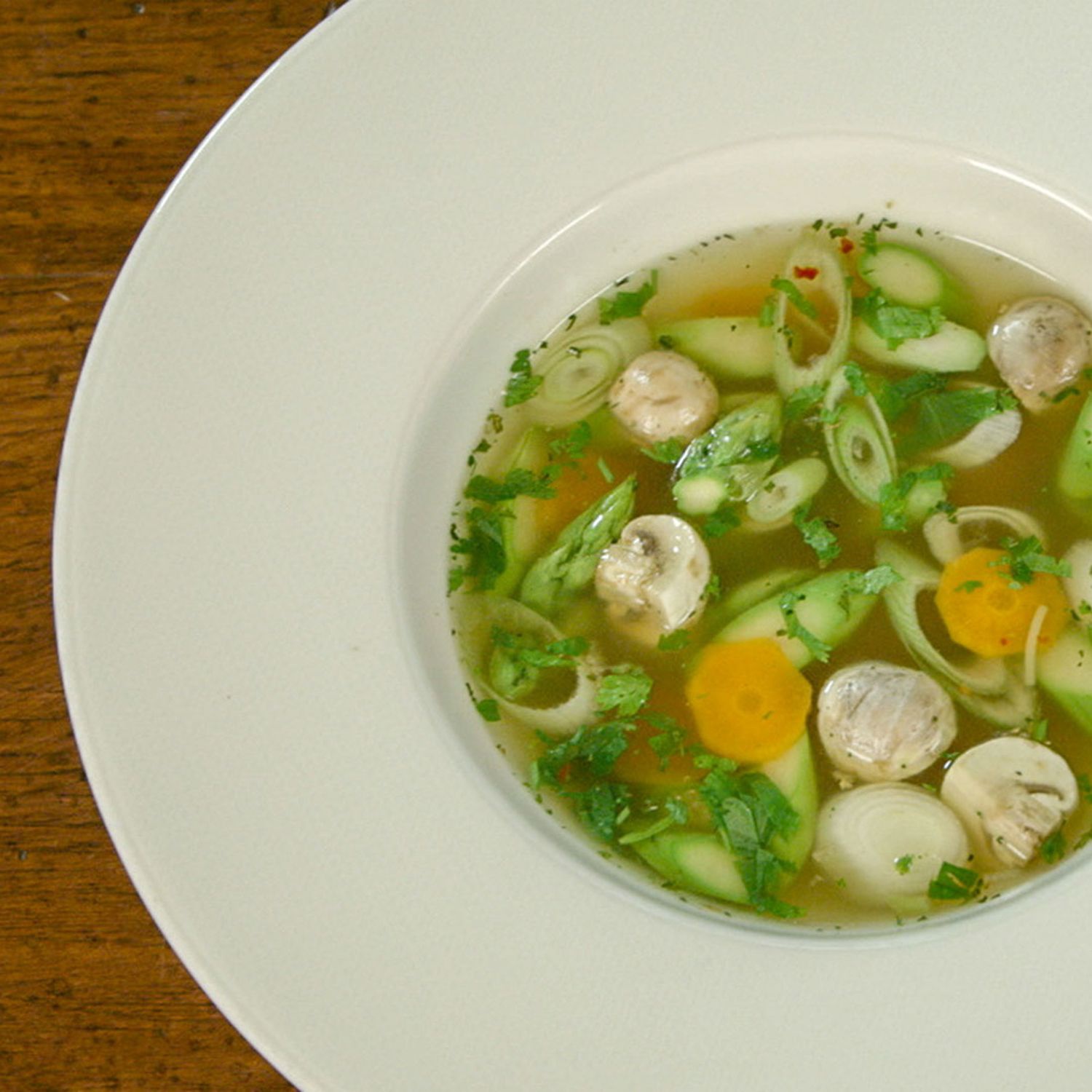 Die Brühe in einem Topf erhitzen, die Karottenscheiben, Champignons, Frühlingszwiebeln und grünen Spargel dazu geben und erhitzen. Die Vietnamesische Gewürzmischung, Ingwer, Knoblauch und Limettenschale hinzufügen. Die Suppennudeln hinein rühren und alles am Siedepunkt etwa 5 Minuten ziehen lassen, bis das Gemüse weich ist und die Nudeln gar sind.