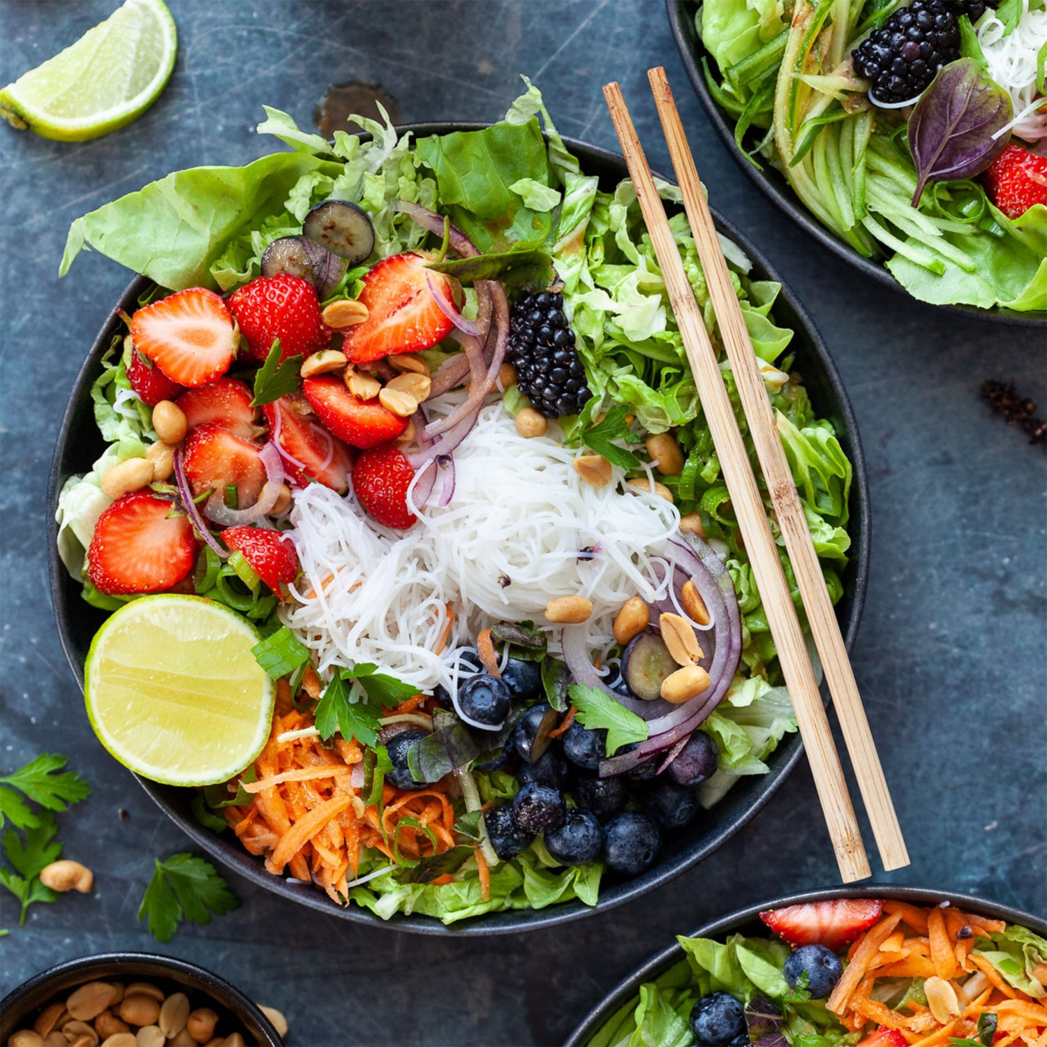 Den Salat und den Chinakohl in eine Schüssel geben und mit Beeren und dem Gemüse belegen. Die Reisnudeln darauf verteilen.