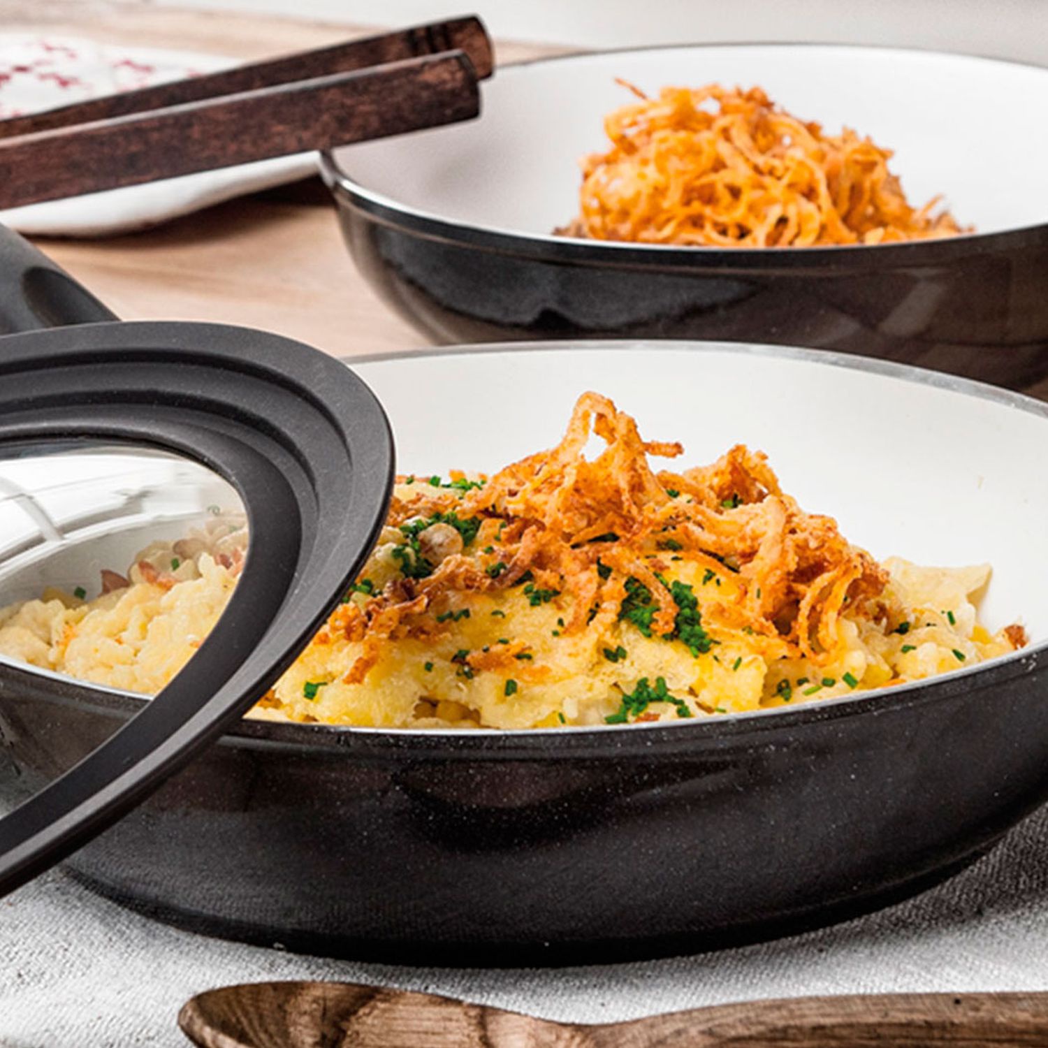 Die Spätzle anschließend im Backofen gratinieren bis sich eine goldbraune Schicht bildet. Dazu eine ofenfeste Pfanne oder Form verwenden. Die fertigen Spätzle zum Servieren noch mit knusprigen Zwiebeln und Schnittlauch garnieren.